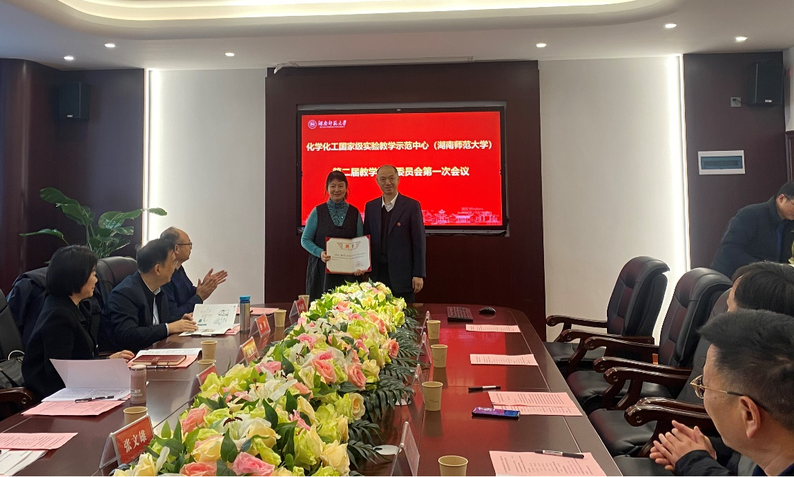 示范中心第二届教学指导委员会委员中国科学技术大学朱平平教授、厦门大学邓顺柳教授、北京大学张文雄教授、北京师范大学李运超教授、湖南大学梁志武教授、南京理工大学钟秦教授、湖南省化学实验教学示范中心联席会秘书长湖南大学郭栋才教授、校资产与实验管理处处长许广、副院长宋春红、“石化新材料与资源精细利用”国家地方联合工程实验室专职副主任毛丽秋和示范中心全体固定人员参加了此次会议。