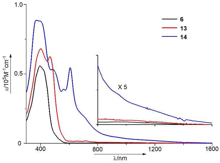 图4. 6,13和14在CH2Cl2中的UV/Vis/NIR吸收光谱