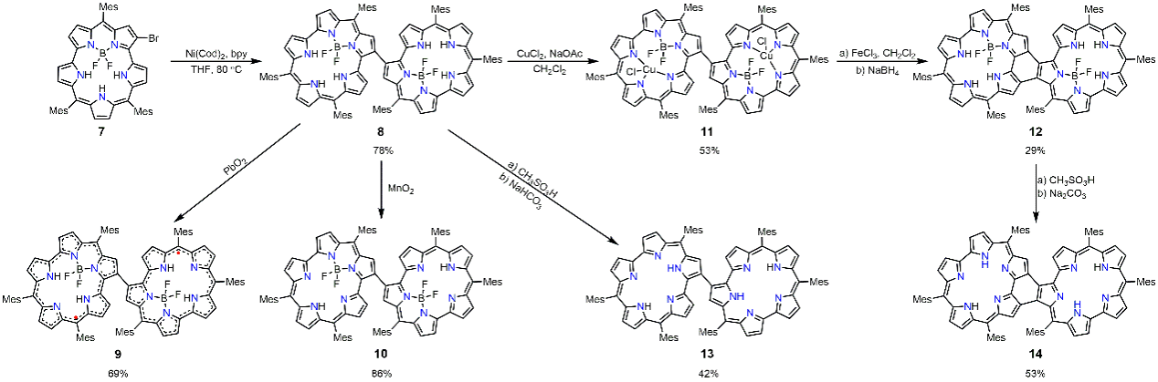 图2. β-β单键连接的smaragdyrin BF2二聚体8、自由基二聚体9、[20]smaragdyrin BF2二聚体10、[20]smaragdyrin BF2 CuCl二聚体11、稠合的[22]smaragdyrin BF2二聚体12、β-β单键连接的[20]smaragdyrin二聚体13和稠合的[20]smaragdyrin二聚体14的合成。