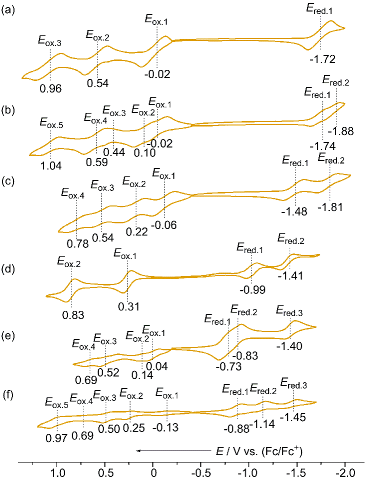 图5. a) 5,b) 8,c) 12,d) 6,e) 13和f) 14的循环伏安图。