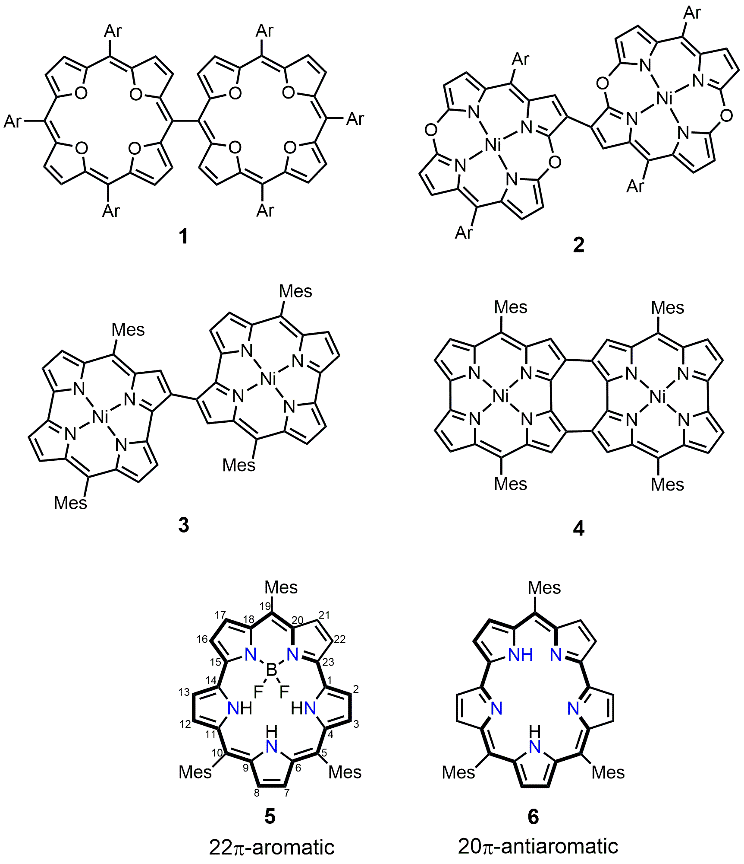图1.反芳香性卟啉二聚体(1-4)、芳香性smaragdyrin BF2配合物5和反芳香性smaragdyrin 6。