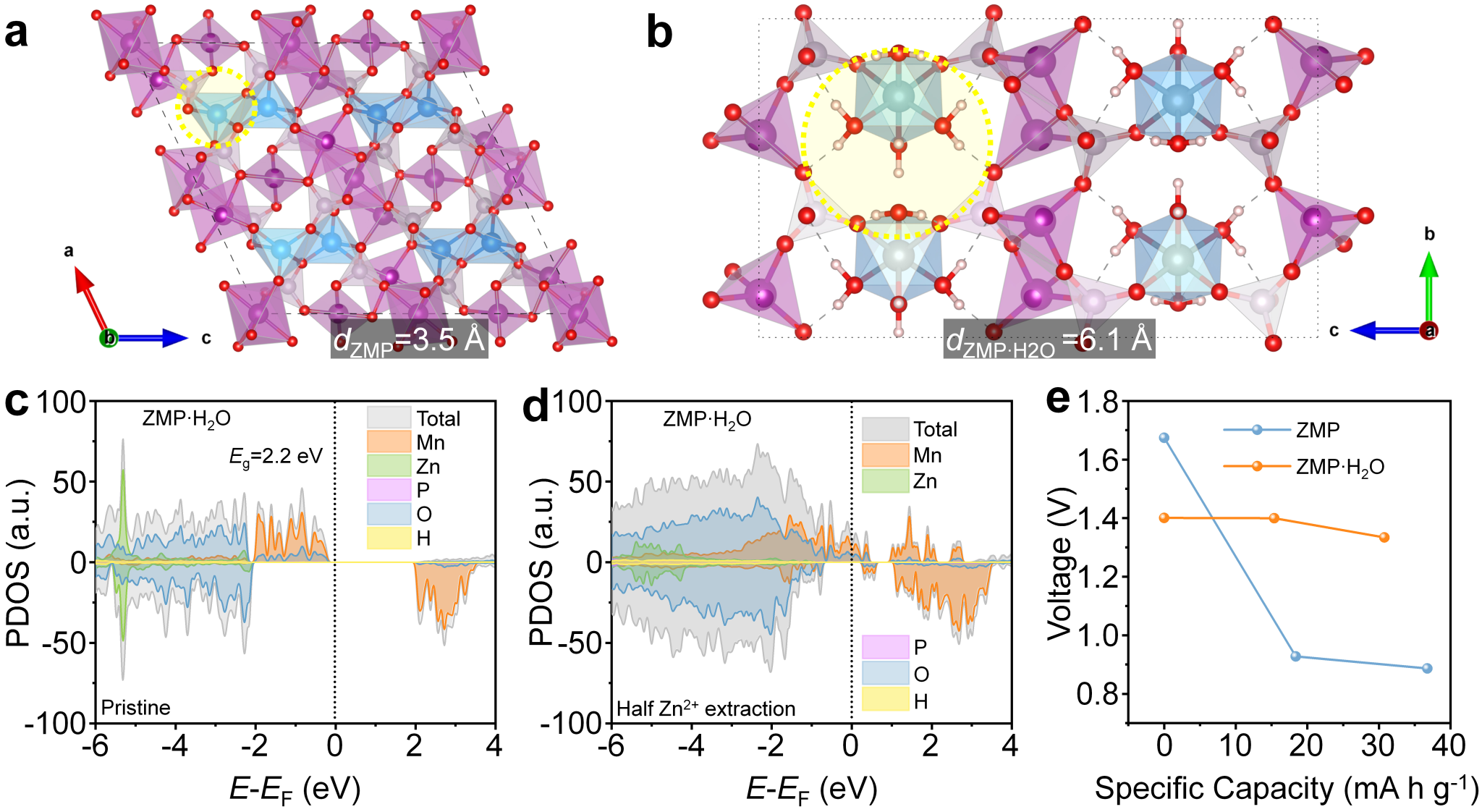 水性锌离子电池受到了广泛关注,因其诸多特性优势:高可逆容量、高安全性、环境友好、原材料安全易得、以及空气气氛下的易操作性。其中,围绕正极材料的研究主要集中在钒基氧化物、锰基氧化物及普鲁士蓝的结构优化或纳米复合设计,开发廉价可逆的新型正极材料仍然是本领域的热门研究课题。在各类有机系二次电池领域中,以磷酸亚铁锂、磷酸铁锰锂、复合磷酸铁钠为代表的聚阴离子正极材料都实现了优异性能和广泛应用,但磷酸盐仍然无法提供足够大的Zn2+离子通道和稳定可逆的嵌/脱Zn2+结构。杨立山老师课题组在本论文首次报道了一种ZnMn2(PO4)2·nH2O(ZMP·nH2O)新结构,是通过电极老化过程中ZnMn2(PO4)2(ZMP)的水合反应获得。得益于晶格H2O分子引入ZMP结构,离子传输路径随着d间距的扩大而扩大,这将进一步促进ZMP→ZMP·nH2O的相变和电化学反应动力学。同时,PO43-中的H2O和O之间可以产生氢键,增强了ZMP·nH2O的结构循环稳定性,降低了Zn2+吸收/去除过程中ZMP到ZMP·4H2O的转化势垒。因此,ZMP·nH2O提供了增强的电化学反应动力学,具有强大的结构耐受性(620次循环后,仍能稳定输出106.52mA h g-1放电容量)。该新型水性Zn||ZMP·nH2O电池为高性能ZIB的工程和探索提供了一种新策略,助力于廉价锰基正极的实际应用。