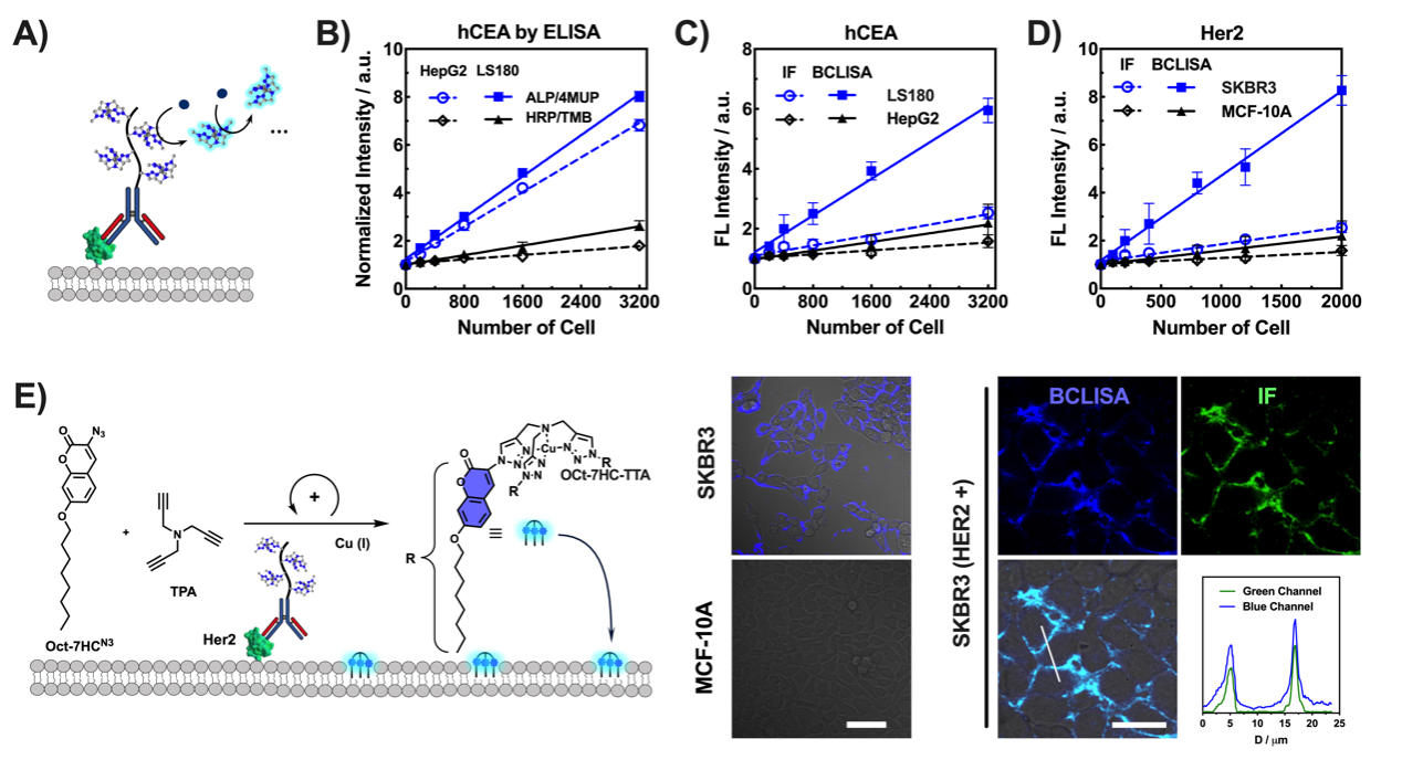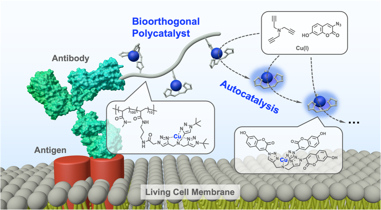 为了解决这一问题,我们课题组开发了一种新的检测方法,称为“生物正交催化免疫吸附检测”(BCLISA),用于检测细胞膜上的抗原。该方法将具有特殊催化功能的小分子或聚合物与抗体结合,以替代传统的酶。经过筛选,研究团队选择了铜(I)催化的叠氮-炔基环加成反应(CuAAC)作为核心反应体系,因为其稳定且能在细胞环境中高效运作。相比于普通的催化剂,聚合物基催化剂具有多个催化位点,因此在相同浓度下能够产生更高的活性。此外,CuAAC反应生成的聚三唑化合物可以螯合铜离子(Cu(I)),从而进一步加快催化过程。这种自催化特性有效提升了BCLISA的信号放大能力。最终,这种自催化整合的BCLISA技术被成功应用于活体细胞膜上抗原的检测和成像,使得科学家能够检测到细胞上稀有的抗原分子。这种新方法为低丰度抗原的检测和成像提供了一个创新的途径,未来或将推动在活细胞中的生物检测技术发展。