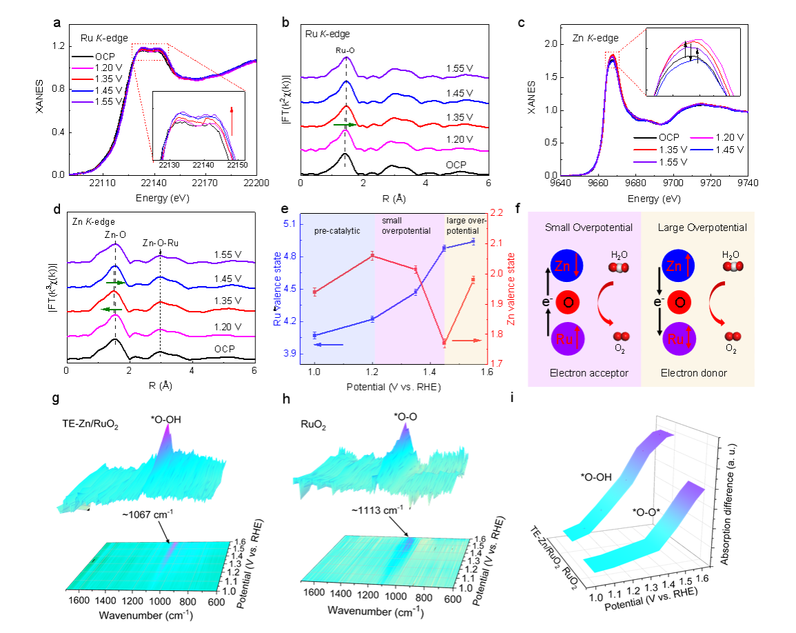 本工作通过模板吸附-刻蚀策略制备了Zn原子掺杂的RuO2(TE-Zn/RuO2)催化剂,在RuO2中加入Zn阳离子和模板不仅引入了低价的Ru活性中心和氧空位,而且降低了Ru−O键的共价。锌掺杂剂在电子接受和给电子过程中的动态循环促进了TE-Zn/RuO2在亚安培电流密度下的持久酸性OER活性。利用原位同步辐射技术观察到Zn掺杂剂作为电子受体,在低电位下通过桥式氧从Ru中心获得电子来激活OER。随后,它们以更高的电位将电子捐赠回Ru位点,以防止Ru过度氧化,促进OER过程中的动态电子转移。关键的*OOH中间体聚集在Ru位点上,成功抑制了大量晶格氧参与OER反应,从而触发了吸附物演化机制(AEM)途径,增强了酸性电解质中的稳定性。