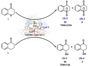 细胞色素P450酶是一类功能强大的氧化酶,其可以立体选择性催化碳氢羟基化,烯烃环氧化,硫氧化等多种反应。由于在其催化循环中会涉及到活性中心血红素的多种氧化状态,这就引发了一个问题,是存在多种活性中间体催化不同反应,还是只有一种通用的活性中间体催化所有的氧化反应?本工作以P450催化不对称硫氧化和碳氢键羟化为模式反应,以刚性底物硫代色满-4-酮和1-四氢萘酮为化学探针,首先通过定向进化的方法,分别获得了具有单一立体选择性以及高活性催化模式反应的突变体,然后通过比较了硫氧化突变体催化羟化反应以及羟化反应突变体催化硫氧化反应的活性和立体选择性,发现其中的差异,由此提出假设存在不同活性中间体催化这两种反应。接着通过以往工作以及过氧化氢酶的实验排除掉两种可能性的中间体,最后通过计算建模的方式确认在这两类反应中唯有血红素-Fe(IV)=O(Cpd Ⅰ)是催化这两类反应的活性中间体。该研究结果进一步阐明了P450催化硫氧化的机理,同时对于P450类蛋白的定向进化改造提供了有效的理论和实际指导。