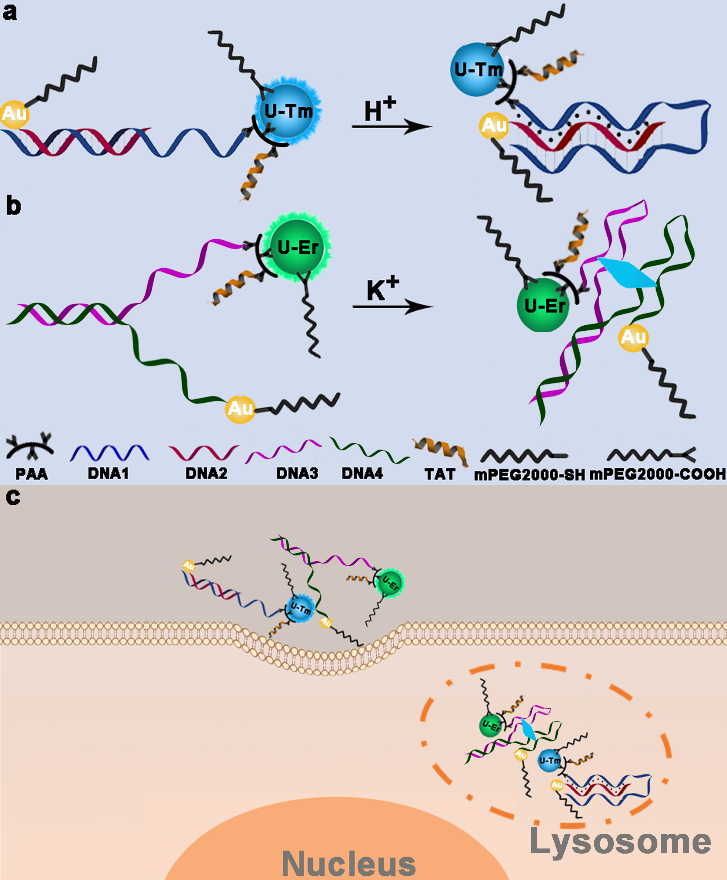 张友玉教授课题组以两个不同发射波长的上转换纳米颗粒为发射体,以金纳米颗粒为淬灭剂,与DNA triplex和quadruplex组装,构建了两种新型DNA纳米传感器,用于溶酶体腔内pH和K+的同时成像分析,以此探究溶酶体的酸化机制。结果表明:DNA triplex和quadruplex传感器成功实现了对溶酶体内的pH和K+的同时成像。在Hela细胞内,受ATP刺激后上述DNA传感器的绿色光信号增强,而DNA传感器的蓝色光信号减弱,表明K+的外流刺激了溶酶体的酸化。由于调整传感器中DNA适配体序列,可以检测细胞中不同种类的生物分子,该DNA传感器可以拓展用于细胞内许多其他分析物的检测和成像,研究解决某些具有挑战性的生化和细胞生物学问题。