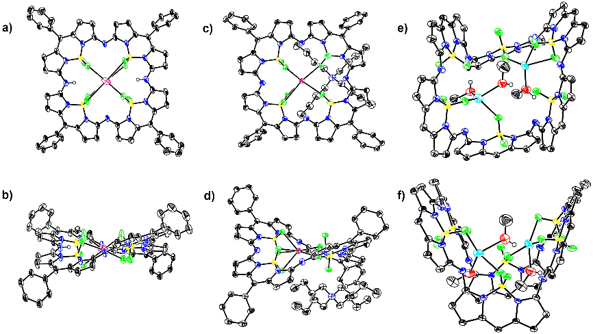 图2. 化合物4 a), b); 7 c), d)及6 e) f)的单晶结构。