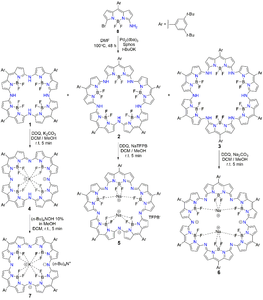 该研究团队将Buchwald-Hartwig偶联反应成功应用于氮杂扩环卟啉的合成,以3-氨基-5-溴BODIPY为原料经分子间关环,一锅法合成了氮桥联环状BODIPY四聚体1、五聚体2和六聚体3。在碱金属离子存在下,化合物1、2和3在芳构化同时能络合相应的碱金属离子得到八元氮杂扩环卟啉钾配合物4、十元氮杂扩环卟啉双钠配合物阳离子5及十二元氮杂扩环卟啉双钠配合物6(图1)。化合物4在四丁基氢氧化铵作用下能进一步脱去meso氮上质子得到八元氮杂扩环卟啉钾配合物阴离子7(图1)。