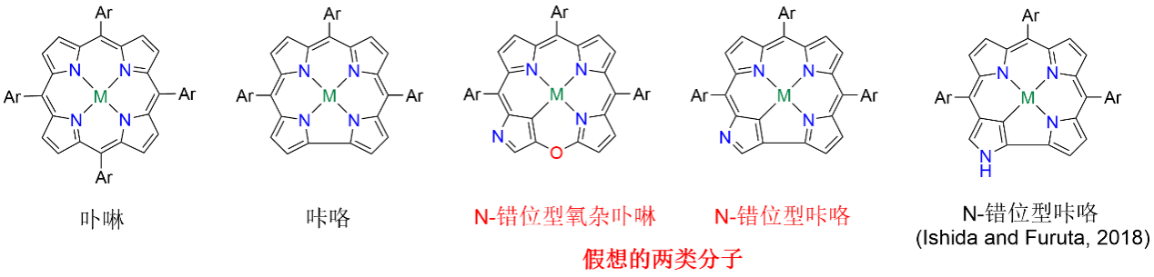 卟啉是一类天然氮杂功能分子,在自然界以及诸多领域中均发挥重要作用。理论上,通过对卟啉大环外围选择性修饰,可构建N-错位型卟啉(如图1所示N-错位型咔咯),并且该结构与卟啉母体组合成共用吡咯单元的卟啉/N-错位型卟啉杂合体,遗憾的是该设计至今未有报道。