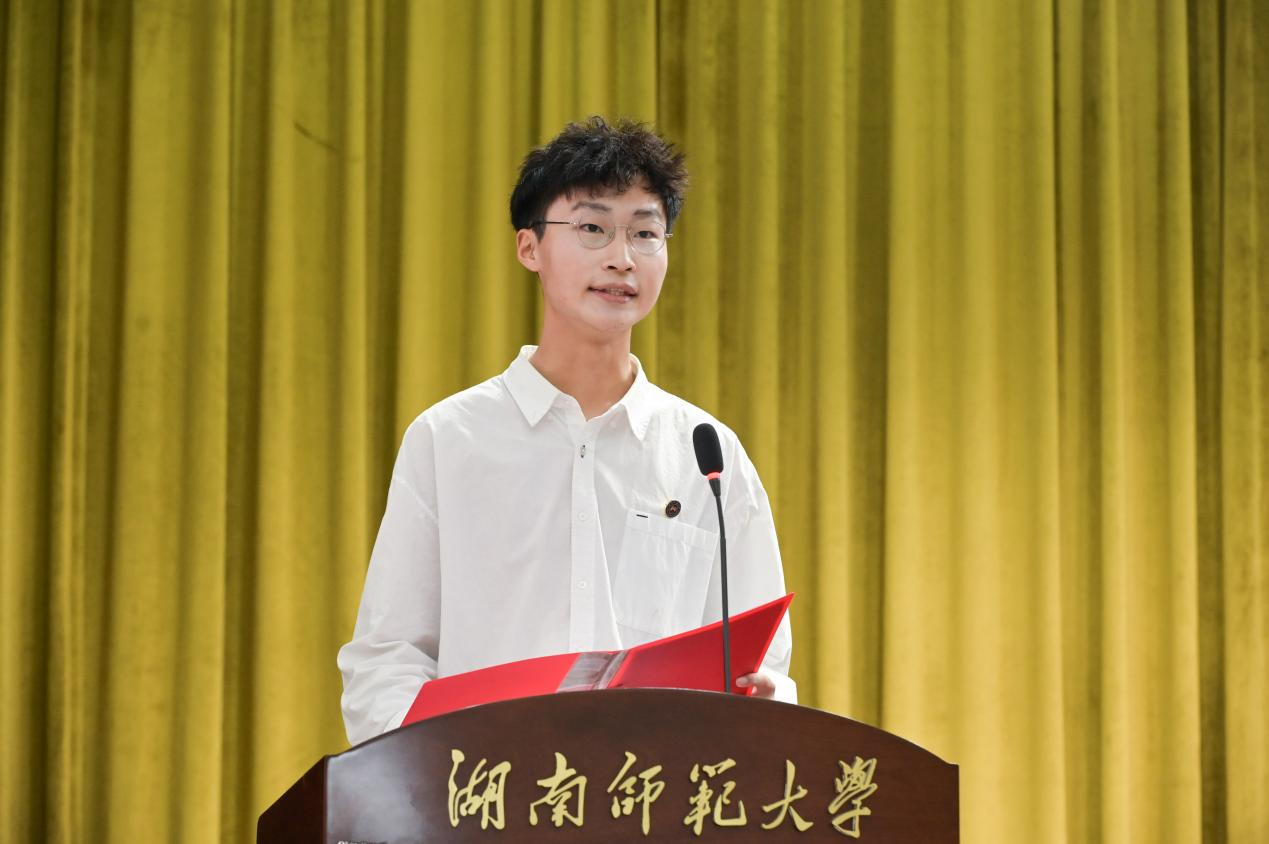 在学校关工委的指导下,学院2020级本科生毛怡洁和刘嘉怡两位同学曾结合尹彦征校友的事迹撰写了一篇题为《他以中国红惊艳世界》的文章,该文在教育部关工委《读懂中国》主题教育活动征文中荣获湖南省特等奖,现已被推荐至教育部继续参评。学生代表在现场发言朗诵《他以中国红惊艳世界》一文,让大家详细了解尹彦征校友所做出的杰出贡献。
