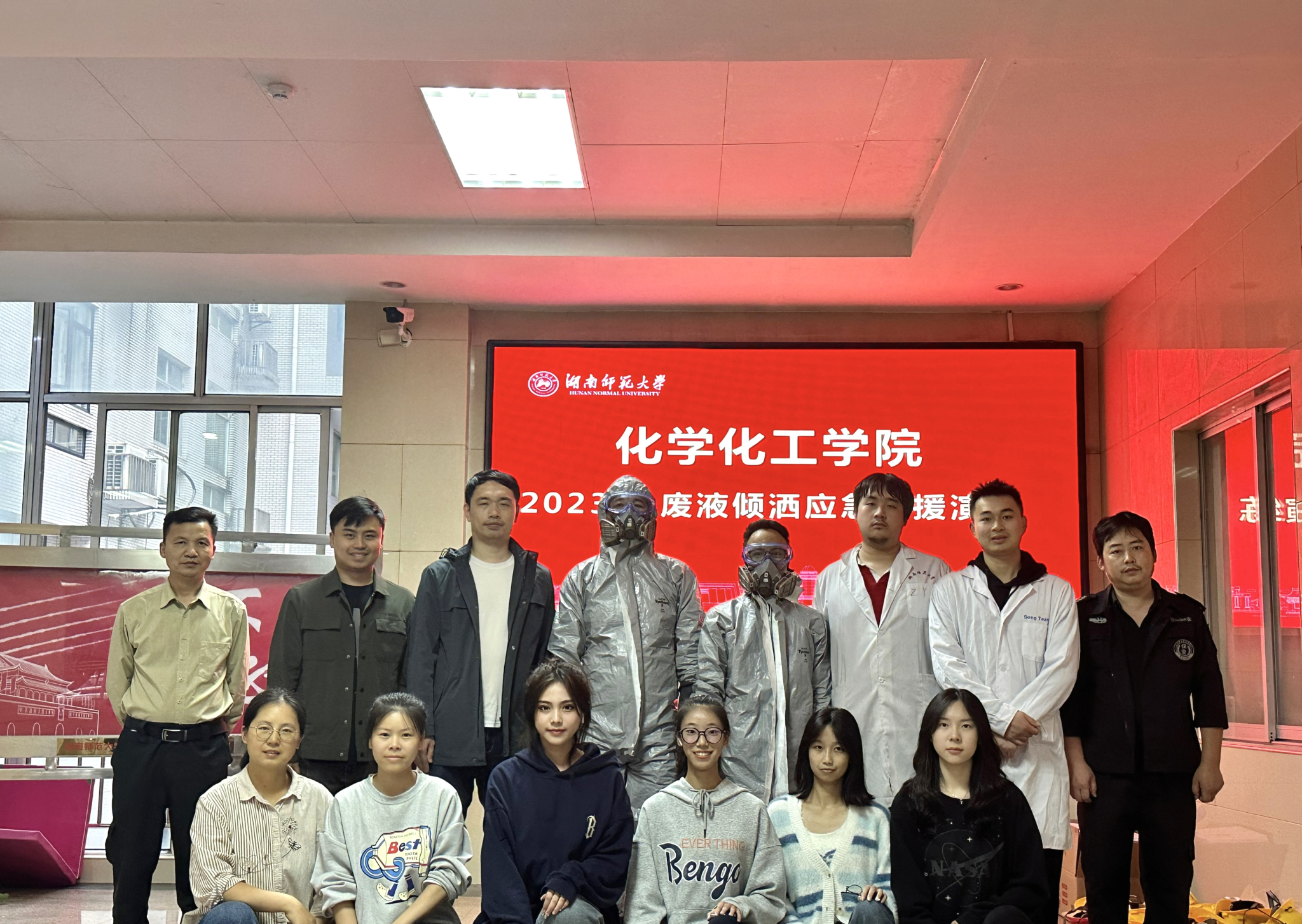 为响应2023年国家安全生产月 “人人讲安全,个个会应急”主题,贯彻校资实处关于2023年“安全活动月“工作要求,同时锻炼和检验英国365集团师生关于实验室安全事故应急处置能力,10月26日下午,英国365集团开展2023年废液倾洒紧急处置演练,副院长宋春红担任总指挥,教育部重点实验室专职副主任周子虬主持。