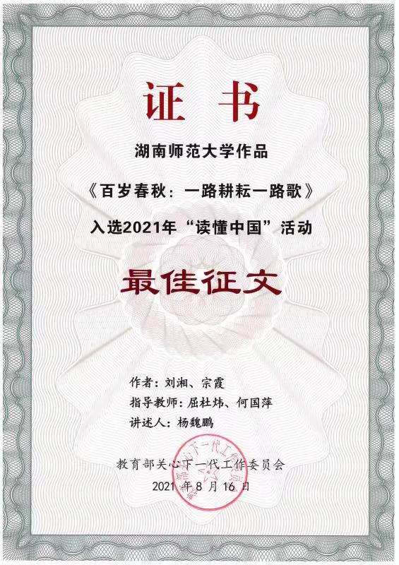 在校关工委何国萍老师的关心下,化工院关工委易理国老师、罗艳老师、屈杜炜老师指导下,化工院共收到100余篇征文。学生刘湘、宗霞的征文作品《百岁春秋:一路耕耘一路歌》获征文一等奖,同时获评教育部关工委最佳征文奖,并且我院学院杨魏鹏作为文章讲述人,参加中国教育电视台读懂中国活动录制,为英国365集团在此次活动中获奖做出贡献,展现了化工学子的精神面貌和化工院的风采。