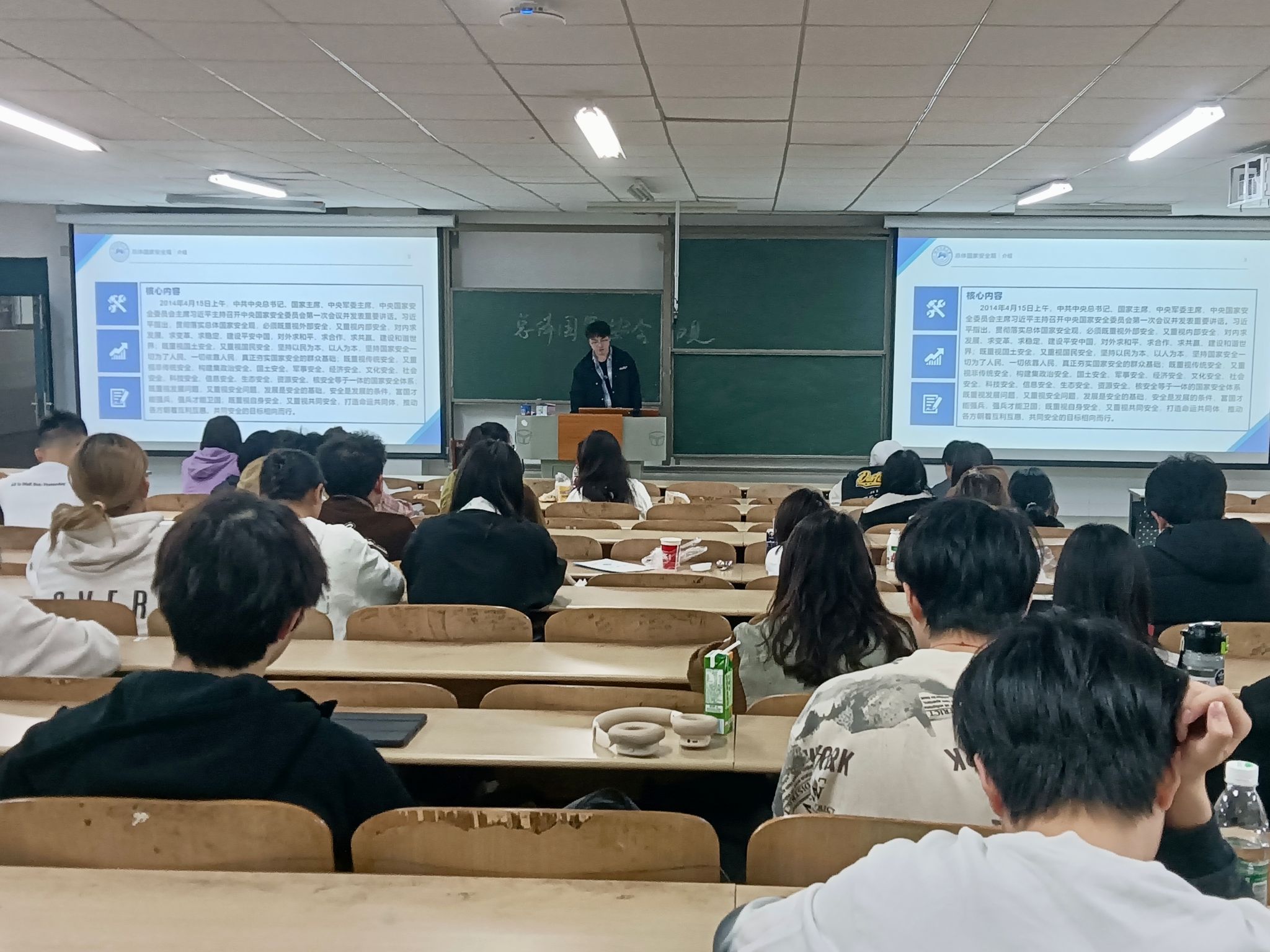 王宇杨从核心内容、核心要义、包括领域和发展历程四个方面向大家介绍了总体国家安全观的相关知识,并围绕设立背景和法定义务告诉大家开展全民国家安全教育的必要性。随后开展的知识问答让同学们进一步加深对班会内容的了解。