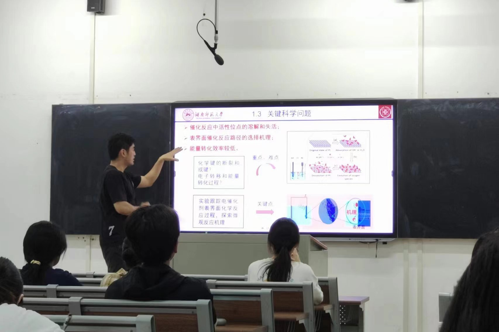活动伊始,苏徽介绍了他的研究背景——能源危机+环境污染;研究目标——发展高效、稳定的电催化剂,实现电能-化学能的相互转化;研究重点——如何获得并利用新型能源氢能。苏徽重点介绍了一种用来揭示表界面反应机理的方法:同步辐射方法,并让在场的学生们观看了一段视频,使同学们了解到同步辐射是一种光,能够探测材料的原子结构,表征各种反应物质,而原位同步辐射是实时精准表征界面结构的重要手段。同时,苏徽分享了其自身的科研经历并告诫同学们:科研是一种很严谨的事情,是验证性的,在进行科研的过程中遇到问题,首先要学会自己思考,并要持之以恒,不要半途而废。而后,苏徽向同学们讲述,在大学要学会发展与规划,并分享了其在保研的过程中与导师面试的故事,传授了同学们面试的经验方法。最后,苏徽作最后的总结,希望同学们在科学研究中秉持严谨、思考、分析、坚持、创新的精神,在大学生活中学会规划自己的未来发展。