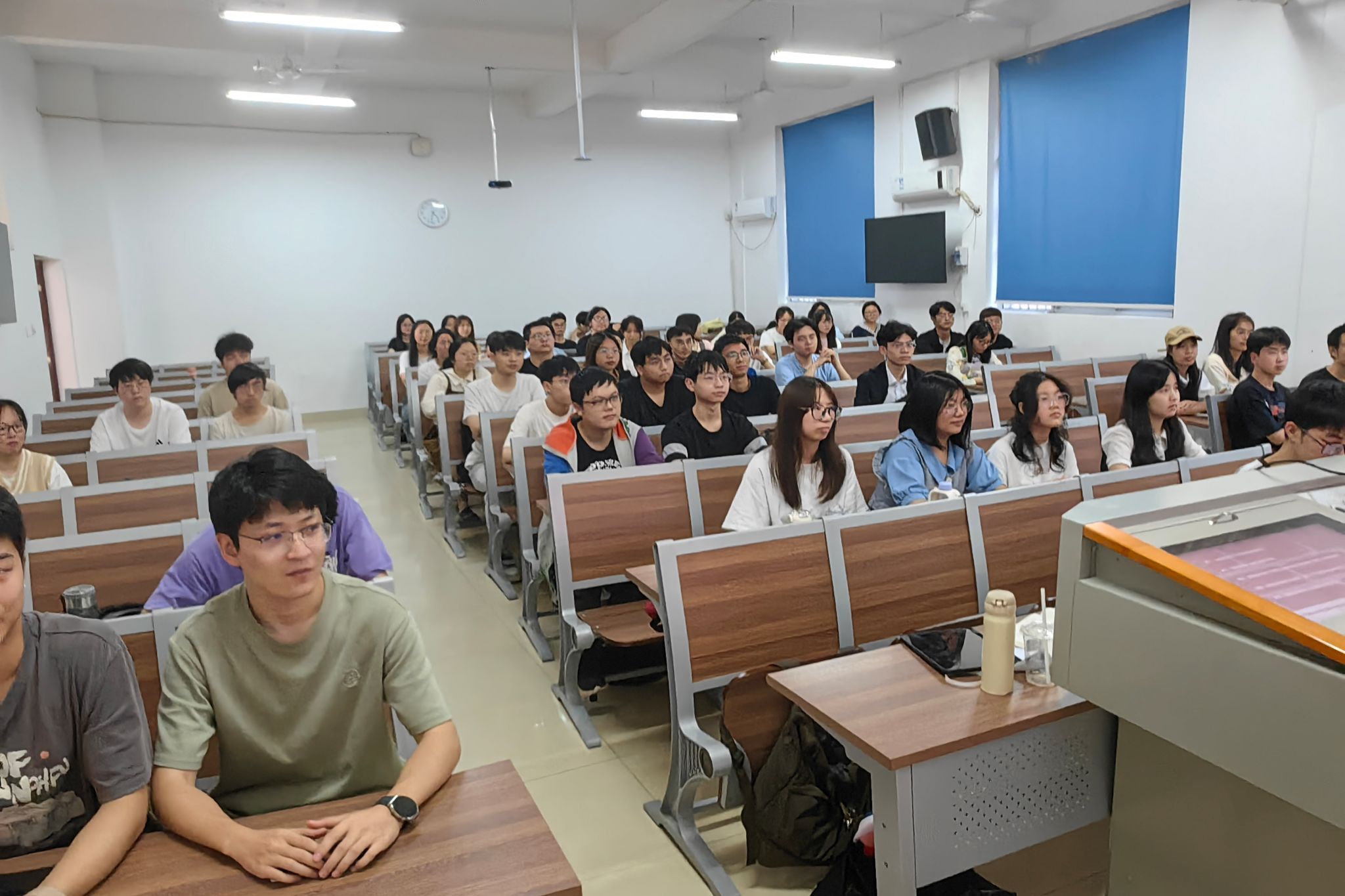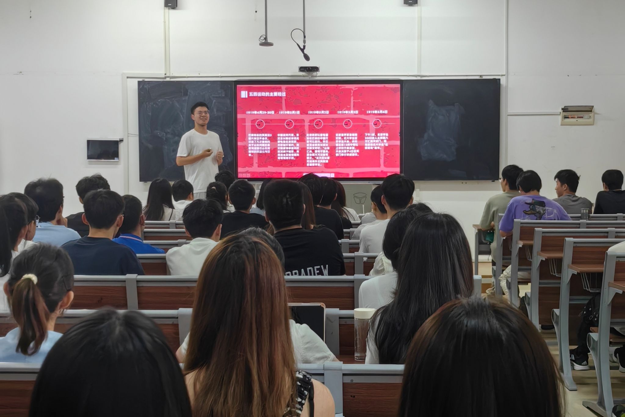 班会伊始,主持人首先通过PPT讲解,图文并茂地展现五四运动的来历、五四精神的内涵和意义。随后同学们一同讨论了如何继续弘扬五四精神、绽放五四精神。此外,两班共同组织了集体朗诵环节。同学们齐声朗诵了李大钊《青春》的节选,用铿锵有力的声音表达了青春的热情与担当。朗诵中,同学们不仅展现了青春的活力,更传递了青年人对于国家和社会的责任与使命。