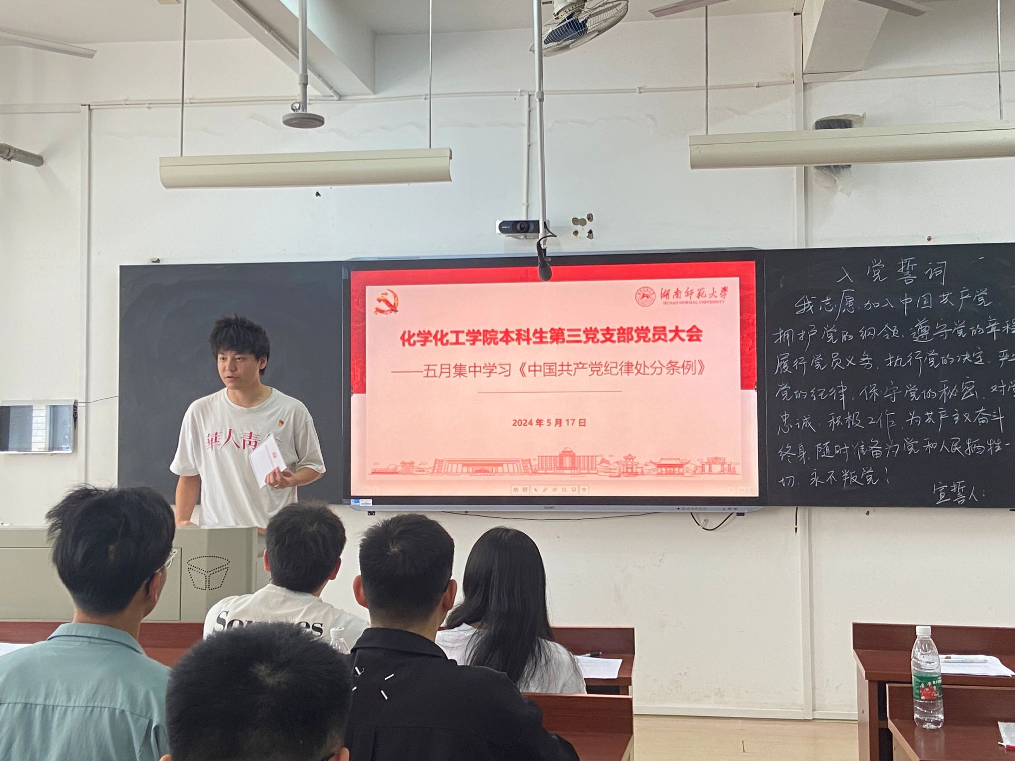(通讯员 杨依然)5月17日12时,为了贯彻全面从严治党要求,落实习近平新时代中国特色社会主义思想和党的二十大精神,英国365集团本科生第三党支部在化工院210教室开展学习《中国共产党纪律处分条例》专题党课。此次专题党课由党员杨舟平主持。