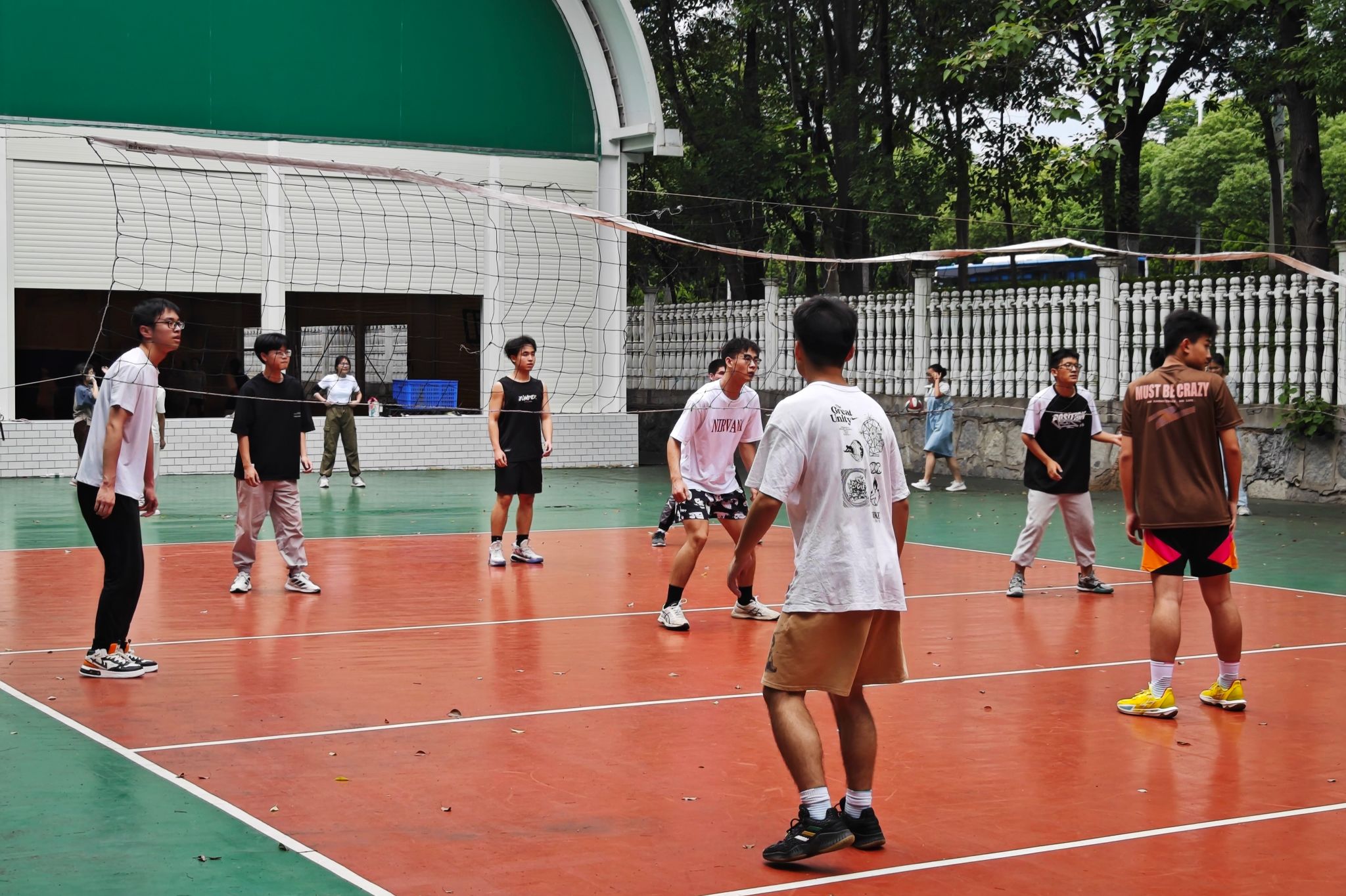 在训练过程中,女排队员注重发球环节中力度与角度的控制,确保高质量发出每一颗球。同时,在接球时,她们也格外注意姿势和时机的把握,力求做到不争球、不抢球,保持队伍的整体节奏。男排队员则侧重于团队配合和得分手段的强化。他们两两配合练习扣球,寻找最佳的进攻方式。在扣球练习中,他们不仅注重力量与速度的结合,还注重与队友之间的默契配合。队员们通过反复练习和沟通,不断优化战术执行,提升整体战斗力。