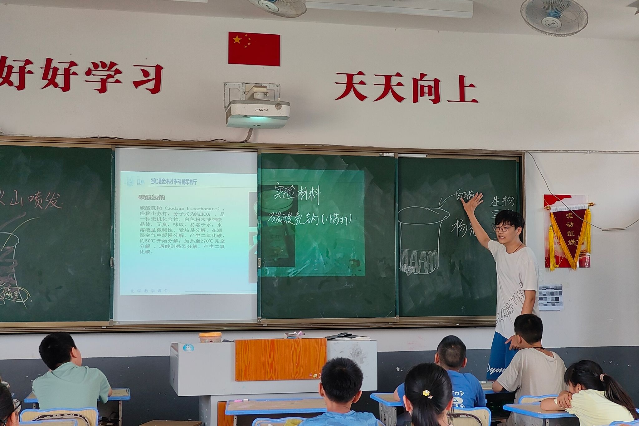 趣味实验伊始,化学老师杨光向同学们介绍了火山喷发的原理,剖析了火山喷发的两个重要因素——液体和大量气体。潘晗悦的实验课程让同学们知道了碳酸氢钠与白醋反应能产生大量的二氧化碳气体,此次实验中在额外加入起泡剂(本实验中由洗洁精替代)的条件下就能达到像火山喷发的效果。杨光为同学们播放了一段简短的视频了解实验流程,助教老师为同学们分发实验试剂,同学们自行将碳酸氢钠与水和洗洁精的混合溶液搅匀,并将白醋迅速倒入混合溶液中,观察到有大量泡沫涌出,形似火山喷发。