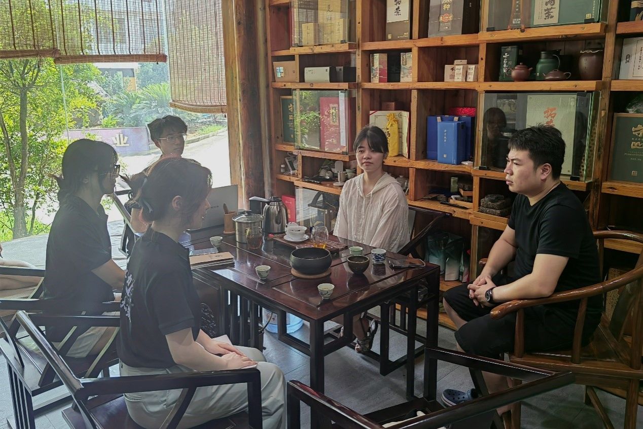 此次调研主要分成三部分的内容:引导人千慧介绍黑茶的种类和制法、八角茶业的负责人龚意成接受朱茜雨和李艳泽的采访、引导人带领组员参观企业文化展览和制茶车间。负责人根据朱茜雨的提问分享了将企业故事做成知识产权的经验,并提出了建成茶旅体验景点的未来规划,使组员们对茶文化和旅游的深度融合有了更深刻的理解。引导人带领组员们参观了黑毛茶、绿茶的制作车间和恒温恒湿成品仓,让组员们对茶文化有了更全面的认识。调研过程中,组员们也品尝了经过松烟熏焙后的天尖茶,领略到了安化黑茶的独特魅力。