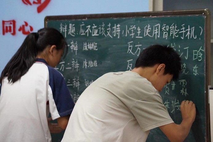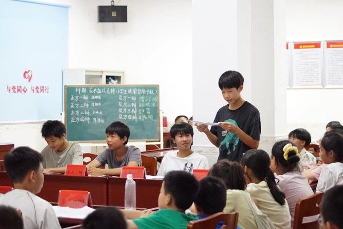 此次辩论赛聚焦于新一代小学生群体中手机使用频繁这一现状,团队成员组织墙背村中小学生就“应不应该支持小学生使用手机”这一问题展开激烈的讨论。正方同学从智能手机便民便利的特性和丰富学习资料多样性的作用出发,细致阐述了自己对于“应该支持小学生使用手机”的看法;反方则以过度使用智能手机产生身心健康问题、小学生容易沉迷于智能手机而荒废学业为着力点,另起新篇,与正方同学进行争辩。在辩论赛中,真理越辩越明,思维越辩越开阔。正赛环节结束后,曾胡杨、周倩妮、王康耀三位评委依次点评。点评结束,主持人宣布比赛结果,获胜方为正方队伍,正方一辩与反方四辩获得“最佳辩手”。