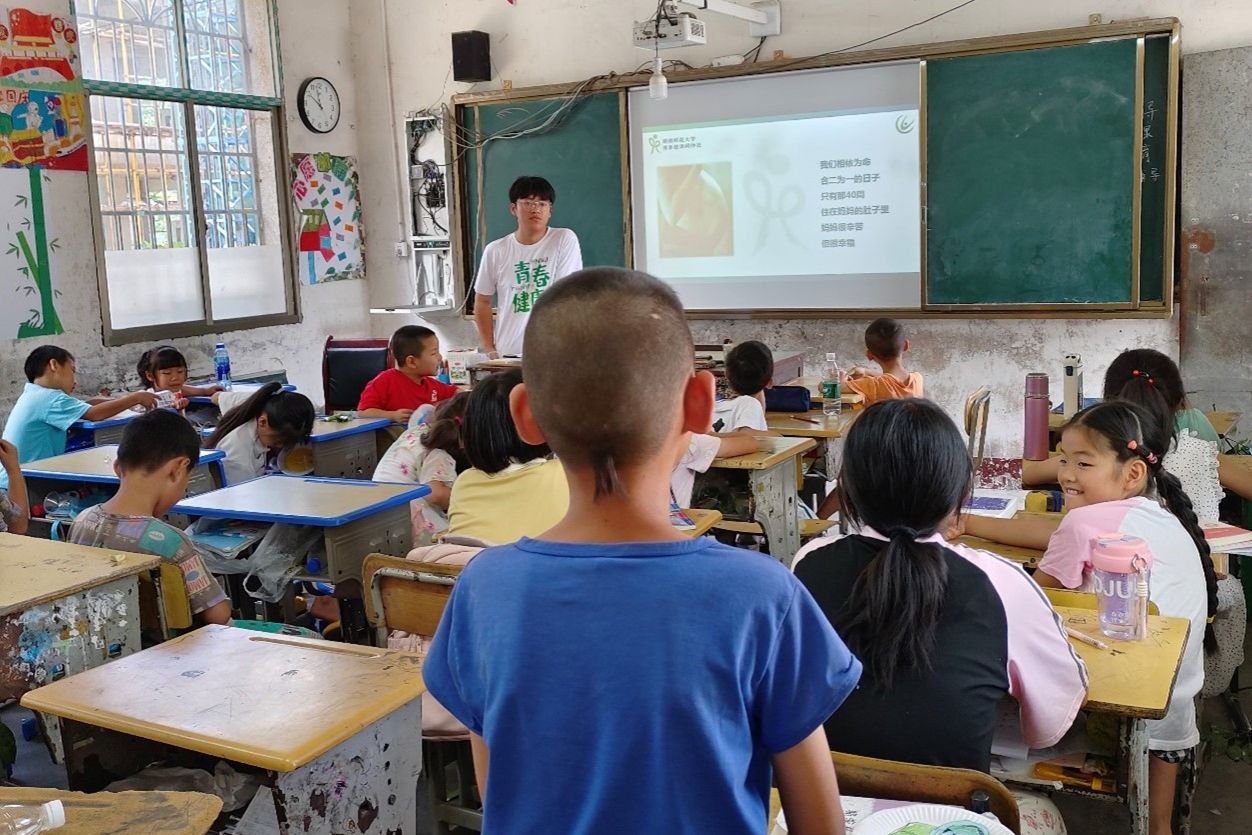 此次课程由实践团成员覃业韬主讲,围绕生命的起源和认识男女生殖系统及其功能两方面展开。课程伊始,覃业韬老师向学生们介绍活动公约,告诉所有人以公平、尊重和保密的态度对待此次课程。他给学生们播放《爱的奇迹》视频,并且从科学的角度讲述了生命的由来和胎儿的生长发育过程,引导学生们体会母亲的不易,感恩母亲,感悟生命并且学会珍爱生命。为了让同学们树立正确的性别观,覃业韬老师讲解了男女生殖系统及其功能并且介绍了生殖器官的科学名称,这对于同学们来说是一次全新的生命科普。