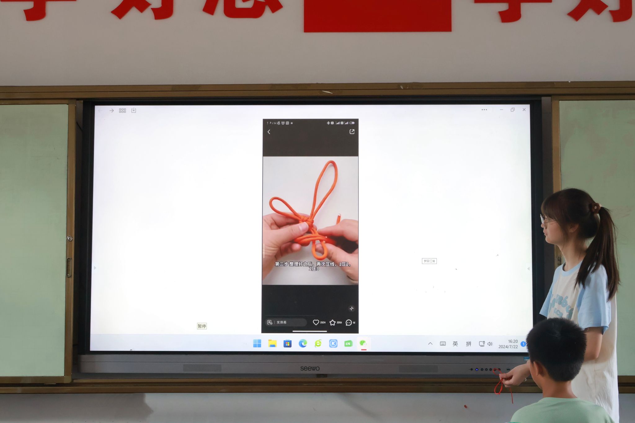 在理论学习环节,老师向学生们介绍了中国结的历史和寓意,让学生们进一步了解中华优秀传统文化。在学生动手实践的过程中,由于中国结的编织难度较大,许多同学都遇到了困难,对此,老师对同学们进行了一对一指导,同时,学生之间也相互沟通和帮助,共同解决问题。课程末,老师邀请学生上台展示,与同学们共同欣赏学生亲手制作的作品。