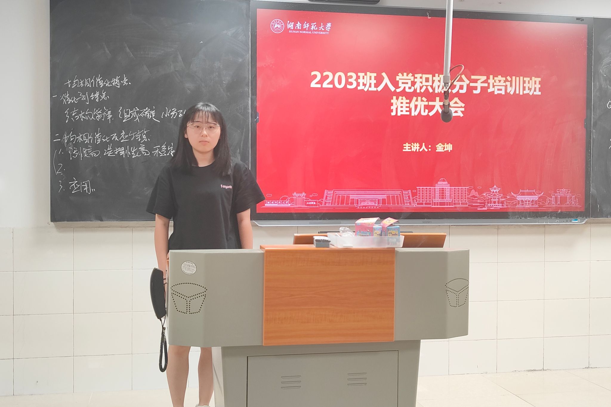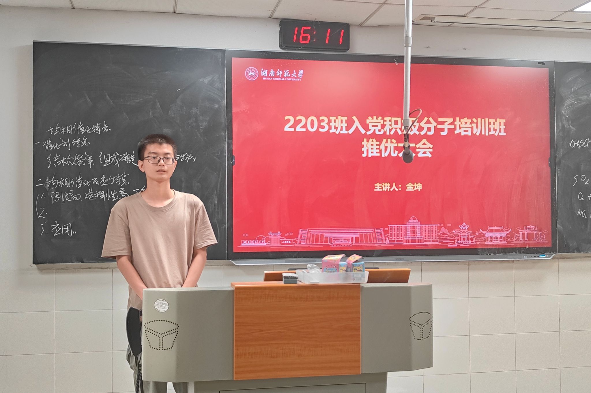 班长金坤介绍了本次推优大会的背景和意义,提出选拔过程必须严格、公正、透明,确保每一位入选的积极分子都具备坚定的理想信念和过硬的政治素质。此次推优的候选人有张满婷、曾靖、屈精科、周思洁、陈晓海和依明江·伊力。候选人依次上台进行自我介绍和思想汇报。每位候选人都详细阐述了自己对党的认识和入党动机。思想汇报环节结束后,大会进入民主评议阶段。通过无记名投票的方式,最终确定了6名同学为本次推优大会的推荐对象。金坤对此次大会进行总结,他对入选的同学表示祝贺,并鼓励他们要继续加强学习,不断提高自身素质,争取早日成为一名合格的共产党员。
