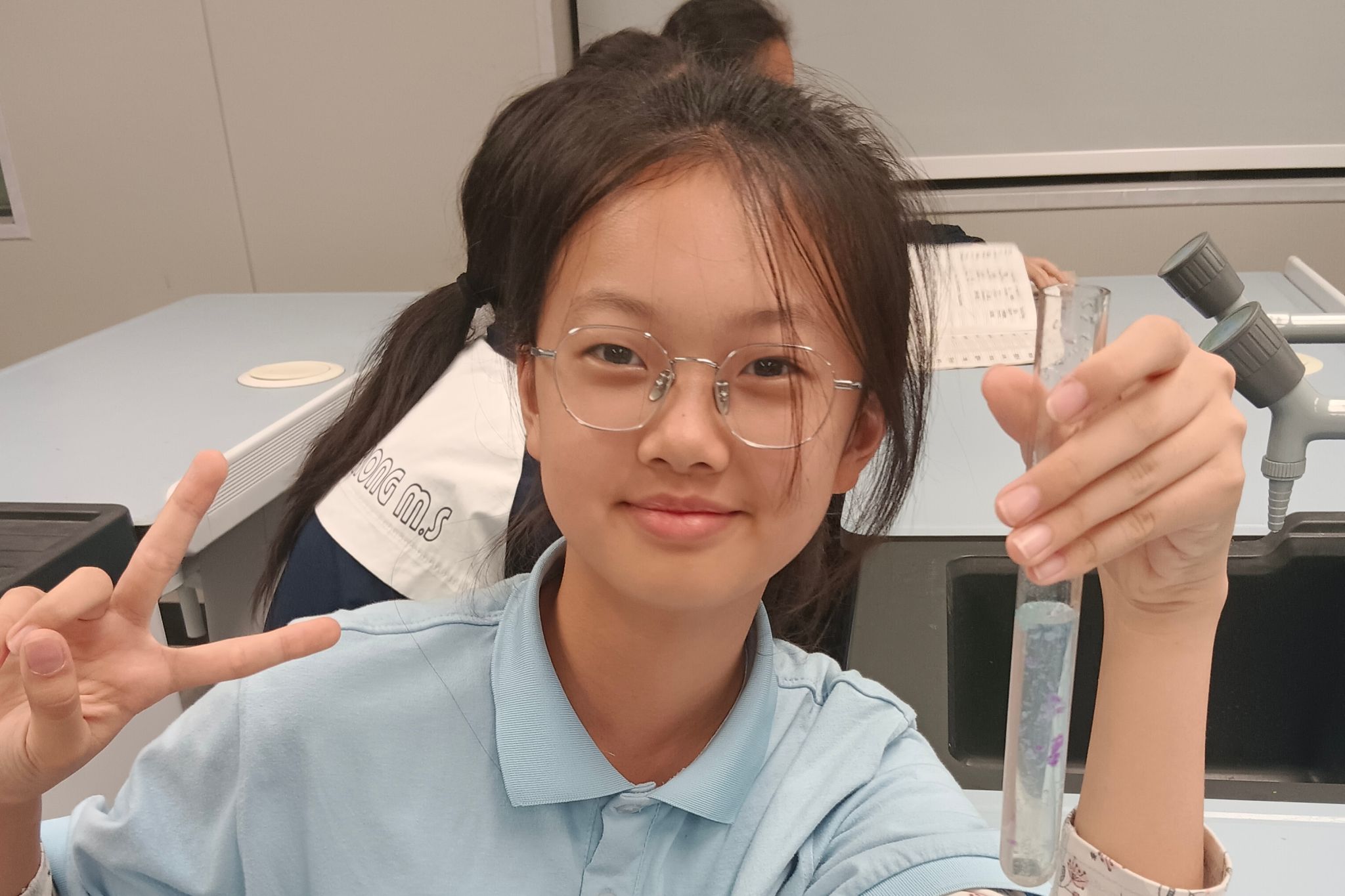 此次课程中,潘晗悦通过视频,展示梦幻晶雨溶液中带来的神奇变化,进一步增加同学们对化学的兴趣,从而引出要做的实验——神奇的“梦幻晶雨”。此次实验分为“薄荷凉夏”“璀璨星河”两个部分,在实验开始前,潘晗悦详细讲解实验步骤及安全规范。在志愿者的协助下,同学们经过了一系列操作过程,观察到一号试管中生成了难溶物氢氧化铜,搅拌后,细小的沉淀宛如雨滴般缓缓降下。接着,在二号试管中滴入酚酞后,稀盐酸与碱式碳酸铜反应,导致蓝色沉淀溶解,红色褪去,同时产生了大量气泡。通过这些实验,同学们亲眼目睹了“薄荷凉夏”与“璀璨星河”这两种奇妙的化学现象。活动过程中,志愿者们带领同学们积极思考、主动探索,为同学们答疑解惑,引导他们交流互动,提高他们的积极性。