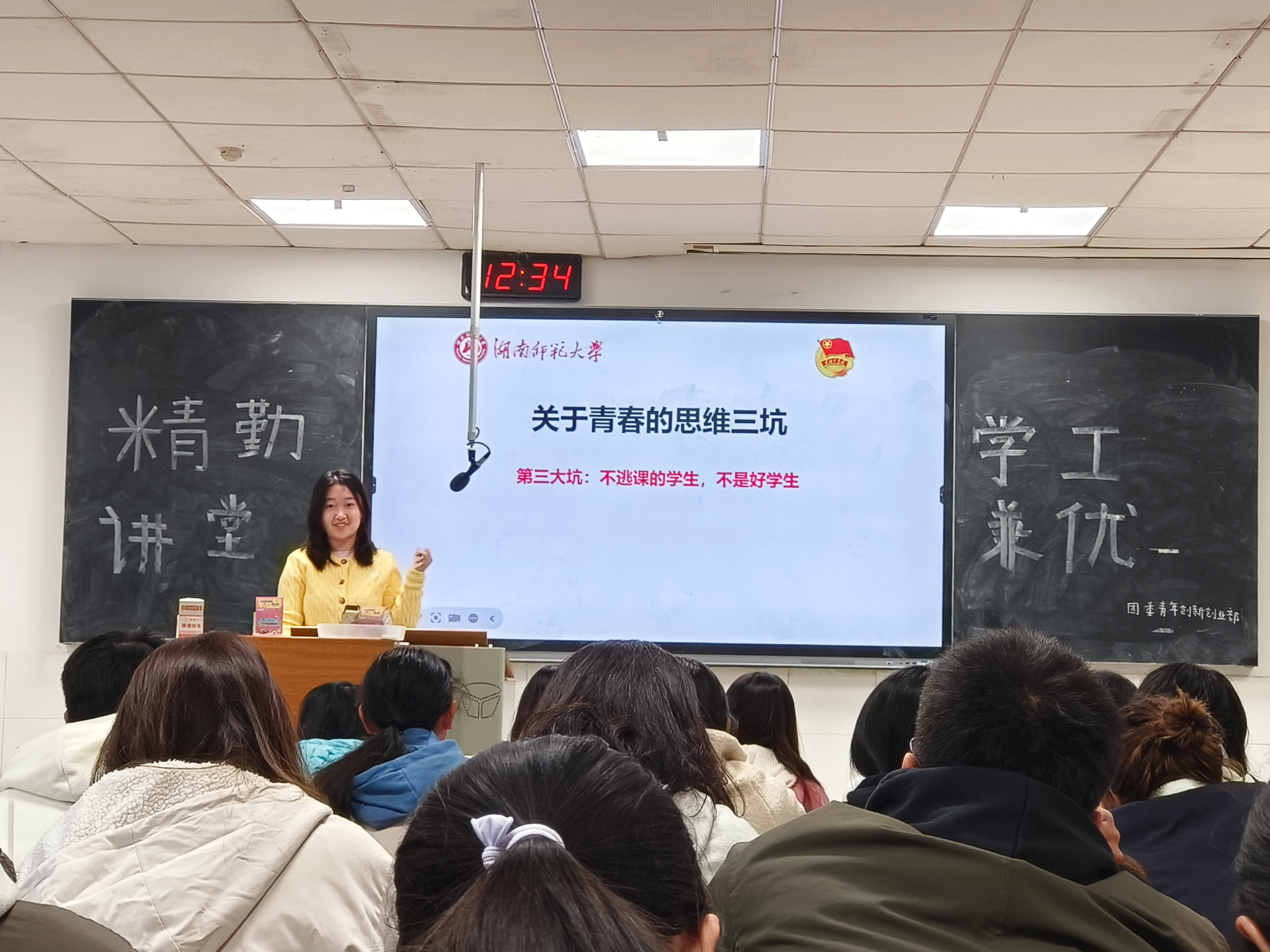 讲堂伊始,陈柳蓉介绍此次讲座的主题及两位主讲人。胡筱晨曾任化学化工院团委学生副书记,她以幽默诙谐的风格,从青春的思维三坑,大学生活的重要性,时间规划和情感四个方面展开,分享了青春如何才能不迷茫的干货,表达了对同学们充实度过大学生活的期望。谭杰文曾任英国365集团团委学生副书记兼学生社团管理服务中心主任,他以学生工作为核心,从德,能,绩,勤,学五个角度论述了学生干部该有怎样的品行,并着重指出学习是学生的本职工作。并以自身经历激励同学们要让青春在汗水中绽放光彩。讲堂结束,胡筱晨和谭杰文与同学们进行了互动交流,解答了同学们关于学生工作和学习方面的问题。