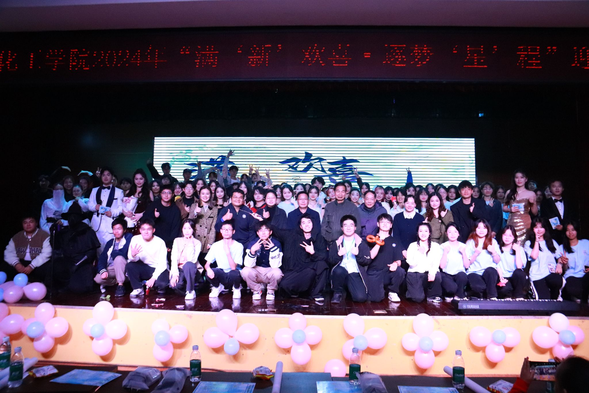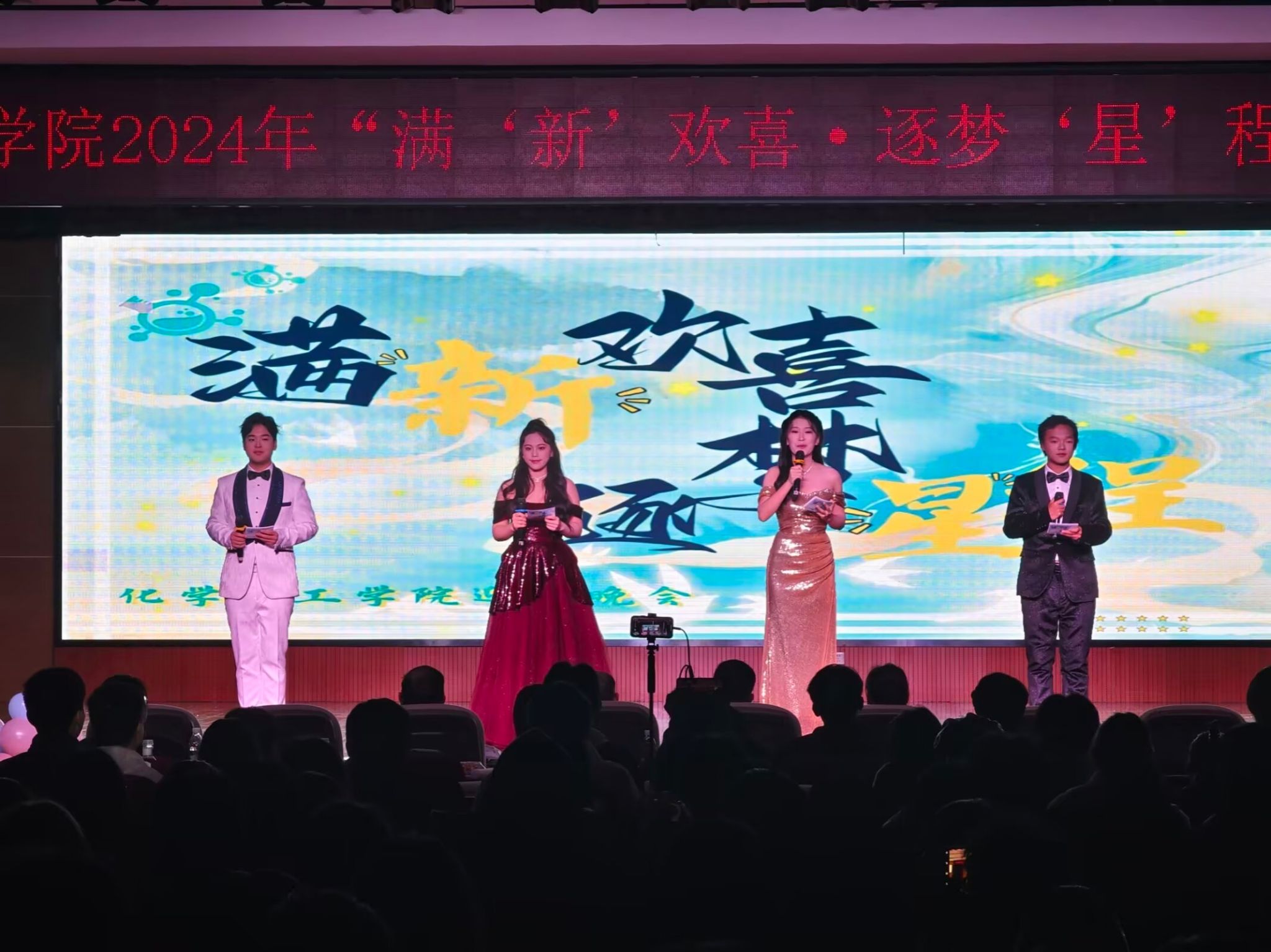 晚会现场的气氛热烈而欢快,仿佛每一个角落都洋溢着同学们青春的活力与激情。晚会节目精彩纷呈,动感的流行乐与活力四射的舞蹈完美融合,表演者们用青春的舞步踏出梦想的节奏,台下观众也随之摇摆,掌声雷动。而当悠扬的古典乐响起,节目《粉墨》的舞者们身着飘逸的古装,长袖善舞,似穿越千年而来的精灵,将传统文化的韵味展现得淋漓尽致;语言类节目《假嬛传》则以幽默诙谐的方式生动再现了大学的生活日常,让观众们在欢声笑语中体会到大学生活的魅力;在《化学与魔法》中,化学与社会协会成员以情景剧的形式展示了奇妙的化学反应,展现了化工院的独特风貌。舞台上各种类型的节目让同学们目不暇接,脸上洋溢着愉悦和兴奋的笑容,欢呼声此起彼伏。同学们分享着彼此的感受和看法,并拿出手机记录下这难忘的瞬间。此外,晚会现场还设置了三轮抽奖,由到场的领导给现场观众抽取幸运号码,这无疑是整场活动中的一个高潮部分。随着一轮轮抽奖的进行,越来越多的幸运儿被选出,每一次的揭晓都伴随着阵阵掌声和欢呼,将晚会的气氛推向了一个又一个高潮。而即便是未能获奖的观众,也在这份共享的喜悦中感受到了满满的幸福与参与感。晚会结束后,领导、老师和全体演职人员上台合影留念。