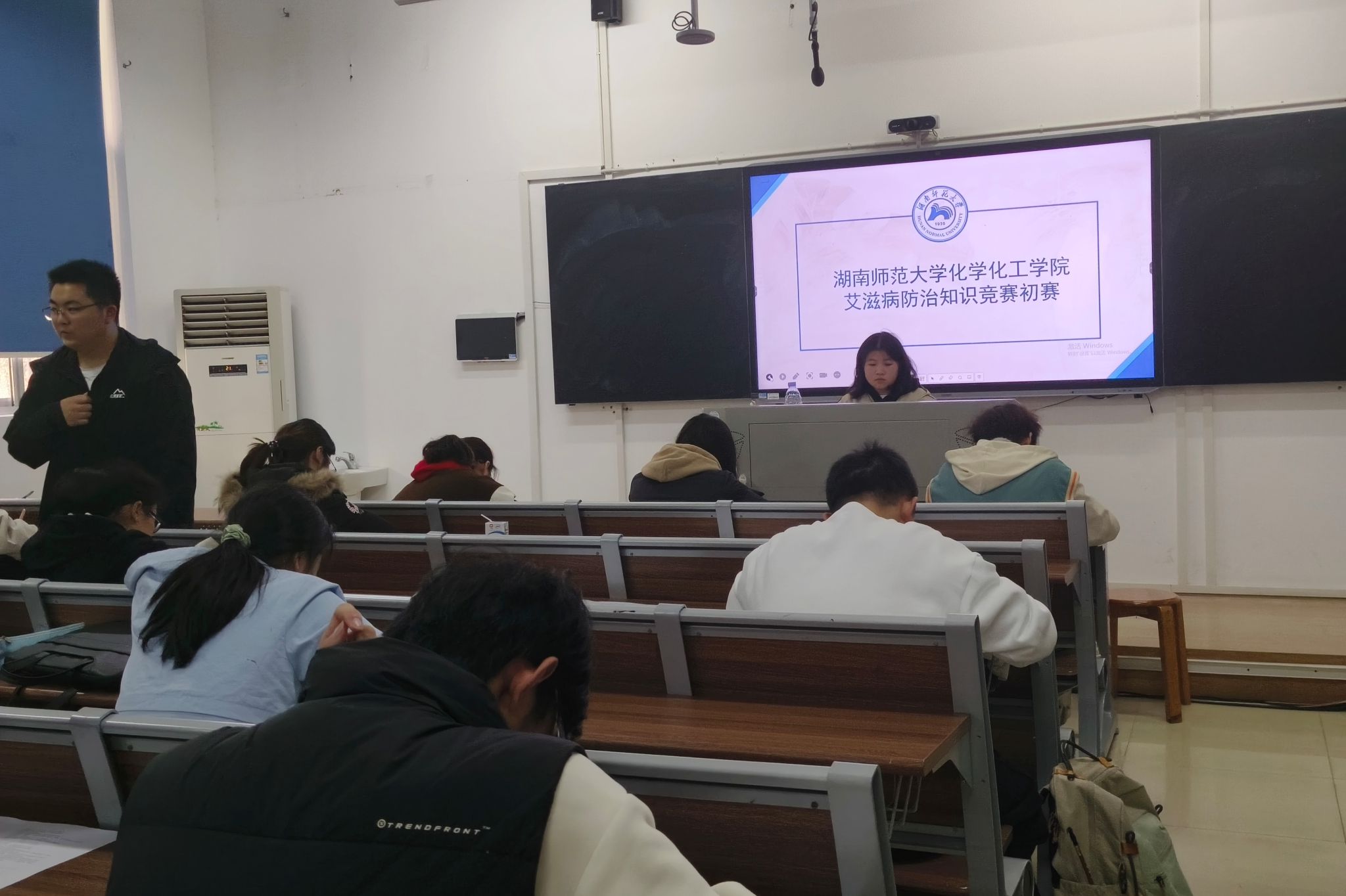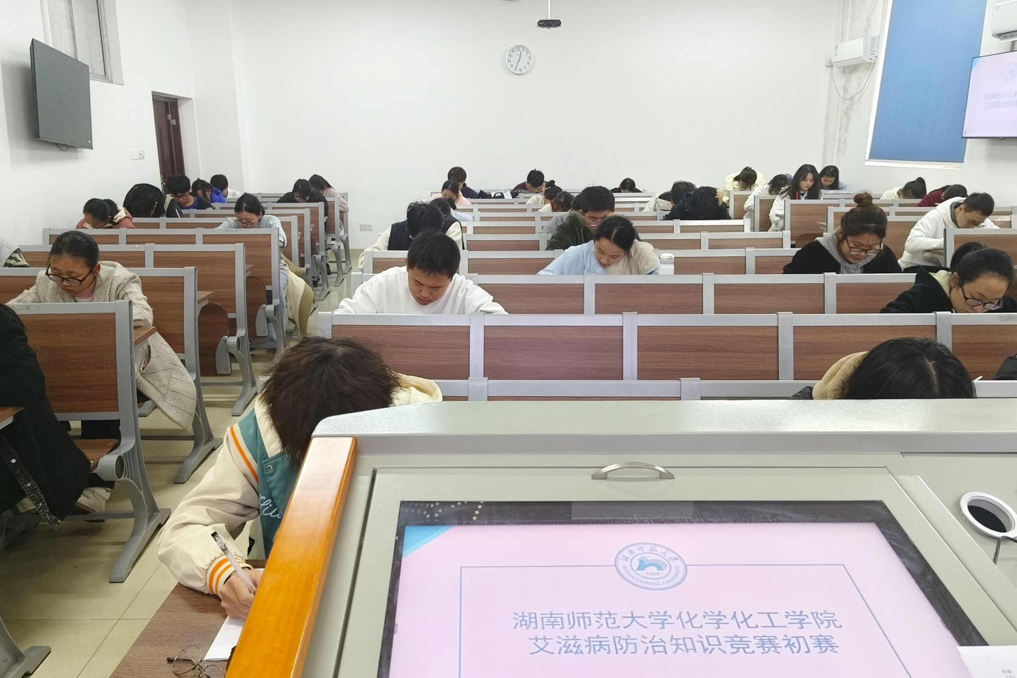 在竞赛过程中,试卷着重考察了艾滋病的传播途径、发病机理、症状以及相关治疗手段等方面知识,题型主要包括单选题、判断题以及简答题,旨在通过知识问答的方式考察以及提高学生的防艾意识和知识水平。考试期间,各参赛同学认真作答,健服部第一负责人韩毅,权益部第二负责人赵子琪和权益部干事汪辰皓进行监考。初赛结束后,由学生会健服部和权益部成员进行线下打分评选。