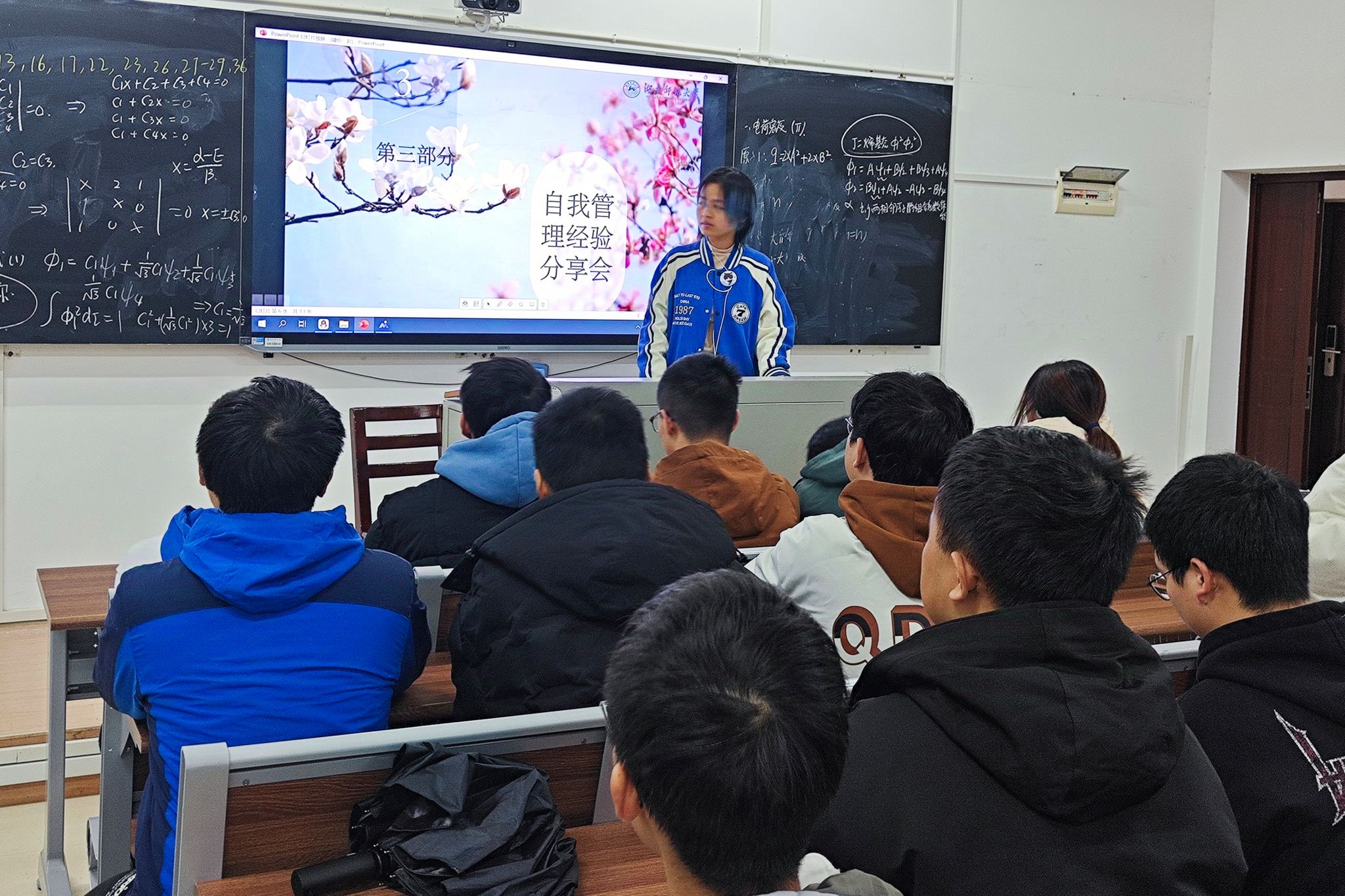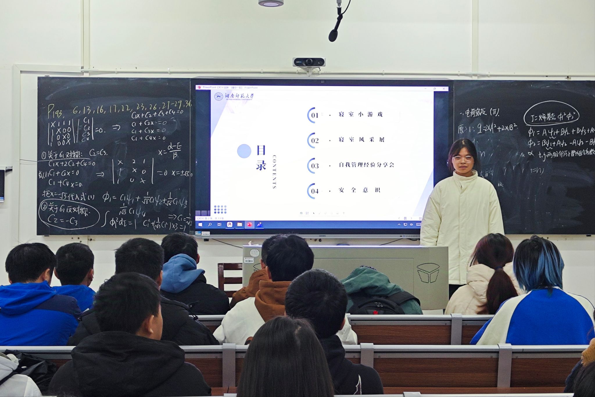 活动伊始,先由主持人刘倩介绍班会流程,此次班会由四个部分组成,分别是寝室小游戏、寝室风采展、自我管理经验分享会及安全意识培训。在游戏互动中,同学们通过游戏、问答等方式,进一步加深了对彼此的了解和信任。在自我管理经验分享会环节上,符甲秀、田光垣等同学分享了寝室成员之间的温馨故事和共同成长的经历,再现了寝室生活中的点点滴滴,既有深夜里的学术讨论,也有周末的集体出游,更有在困难面前携手共进的坚定信念,大家围绕主题,结合寝室生活、团队协作等方面进行了深入的探讨和交流。为了增强安全意识,班会还特别设置了安全教育环节,同学们通过观看安全教育视频、学习寝室安全知识等方式,深入了解了寝室安全的重要性和防范措施。