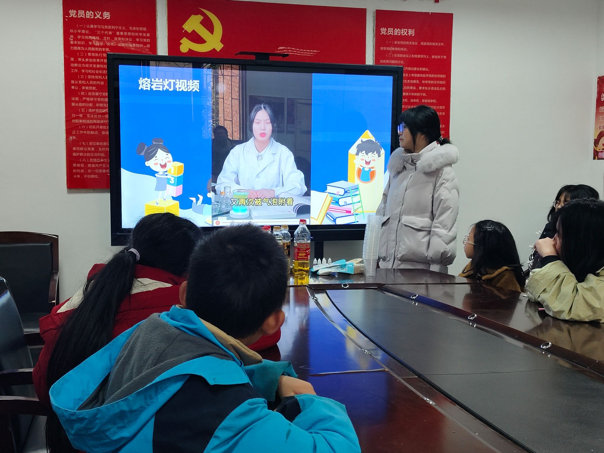 此次活动由负责人徐一珊统筹规划,并在QQ群及空间说说发送活动预告,理事会其他成员协助活动正常进行。活动中,理事会成员向小朋友们讲解PPT并演示实验过程,确保了实验的安全性和步骤的准确性。20名会员和4名小朋友分成4组,6人一组开始实验,各组根据碳酸氢钠和醋酸的复分解反应完成了熔岩灯实验,有色小液滴被气泡带到水面,产生熔岩的效果,让大家对酸碱中和反应有了真切感受。在彩虹雨的实验中,会员们和小朋友将牛奶滴入盐水中,因为牛奶与盐水的密度不同,从而产生了彩虹雨的效果。