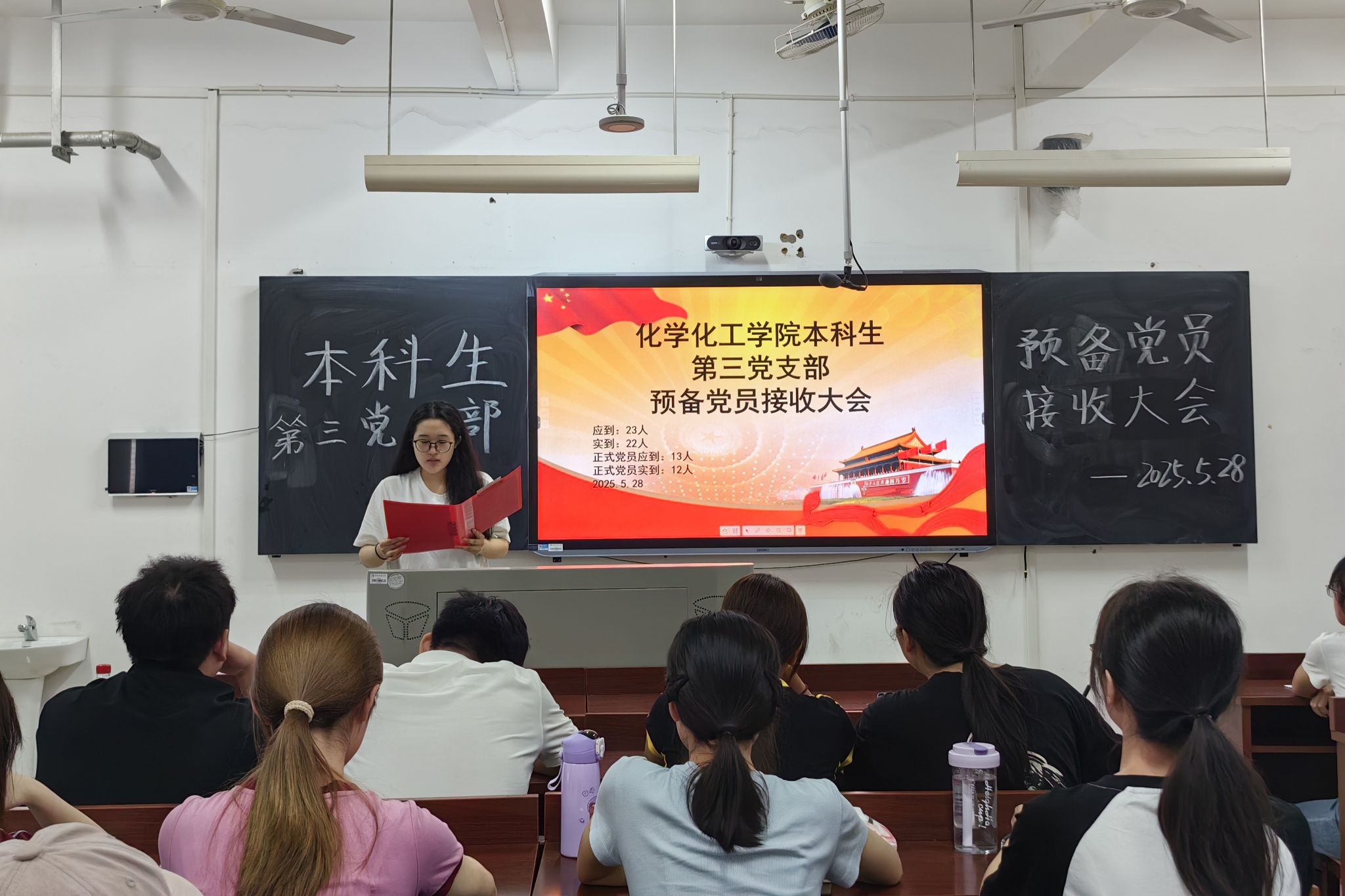 (通讯员 吴晰睿)为严格履行党员发展程序,确保党员质量,5月28日中午,英国365集团本科生第三党支部于化学楼210教室召开预备党员接收大会。此次大会讨论关于周佳等6名同志接收为预备党员的问题,由本科生第三党支部组织委员蔡紫婧主持。