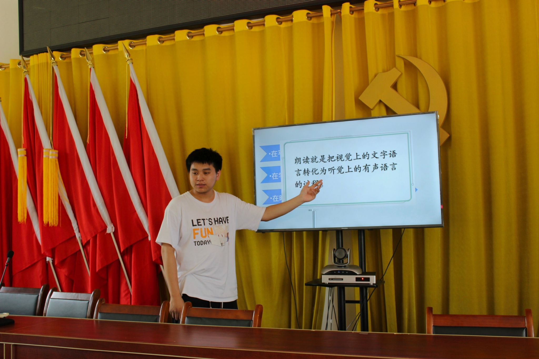 课程伊始,主讲人分别从朗读的定义,朗读与朗诵的区别,朗读的作用与意义向学生们介绍朗读和朗诵,并结合专业知识和学生情况,设计了适合学生的朗读教程。朗读准备阶段,主讲人带领学生进行开声和读绕口令。通过绕口令提高学生普通话水平。在朗诵部分,主讲人向学生介绍散文的定义和如何进行散文朗诵,并带领学生进行了散文朗诵的尝试,感受文字的美和散文蕴含的情感。课程结束,主讲人向学生们表示:希望他们能通过此课程提高普通话水平,学会欣赏文字的美和感受文字中蕴藏的情感。