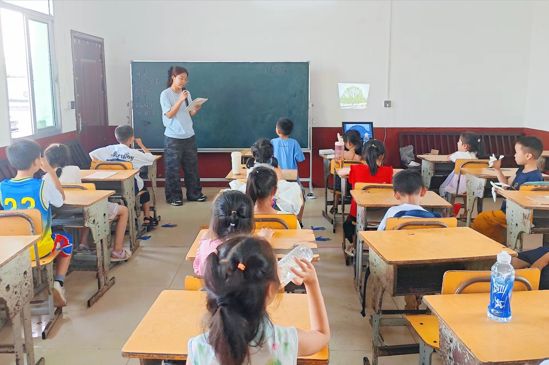 课程伊始,于晓涵以“猜字谜”小游戏为导入,通过精准的拼音标注与多遍的集体诵读,文字的形象深深烙印于学子心中。一张村委会门前大树的图片吸引了学生们的兴趣,于晓涵顺势引导,以问答互动的形式多维度阐释了树木的宝贵价值:它是村民休憩娱乐的诗意空间,是动物们的温馨家园,是生态系统的坚实屏障。为活跃课堂气氛、于晓涵以“开火车”接龙形式让同学们依次朗读《大树和鸟儿》、《小蚯蚓》、《小蜜蜂》等小口令,这些朗朗上口的旋律拓宽了同学们对生态保护的认识。在进行课堂总结时,大部分同学已能较为熟练地掌握生态保护方面的相关知识。