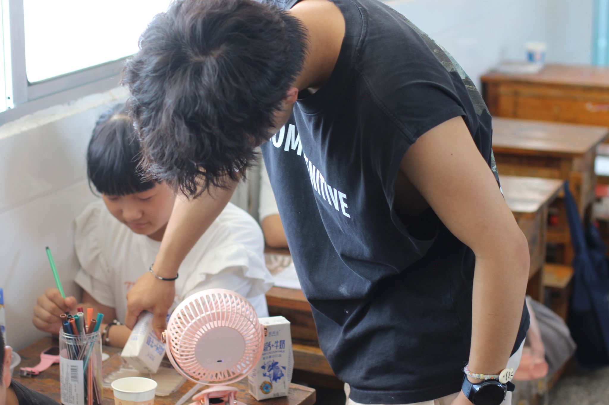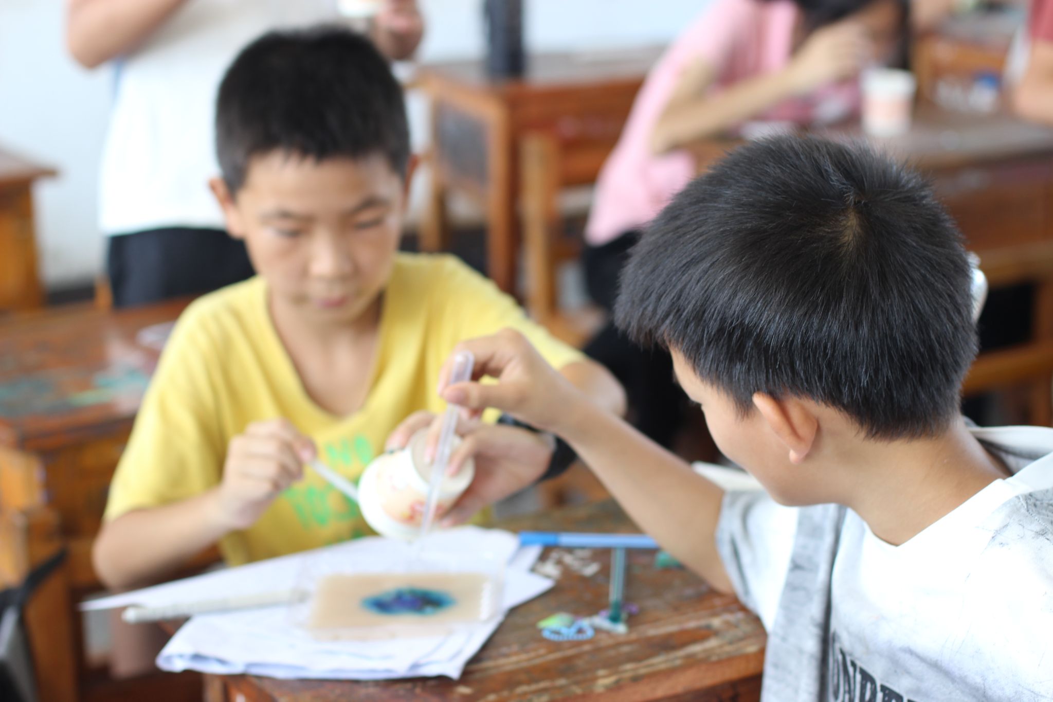 随后,实践团成员陈馨悦和许启洋为学生分发材料,组织大家动手实验,引导学生观察色彩扩散过程,思考内在关联。实验结束后,方子毅与小朋友们一同分析不同水彩笔颜色、洗洁精滴数对“水中烟花”效果的影响,鼓励大家在生活中多留意类似现象,尝试用简单材料进行更多科学小实验。