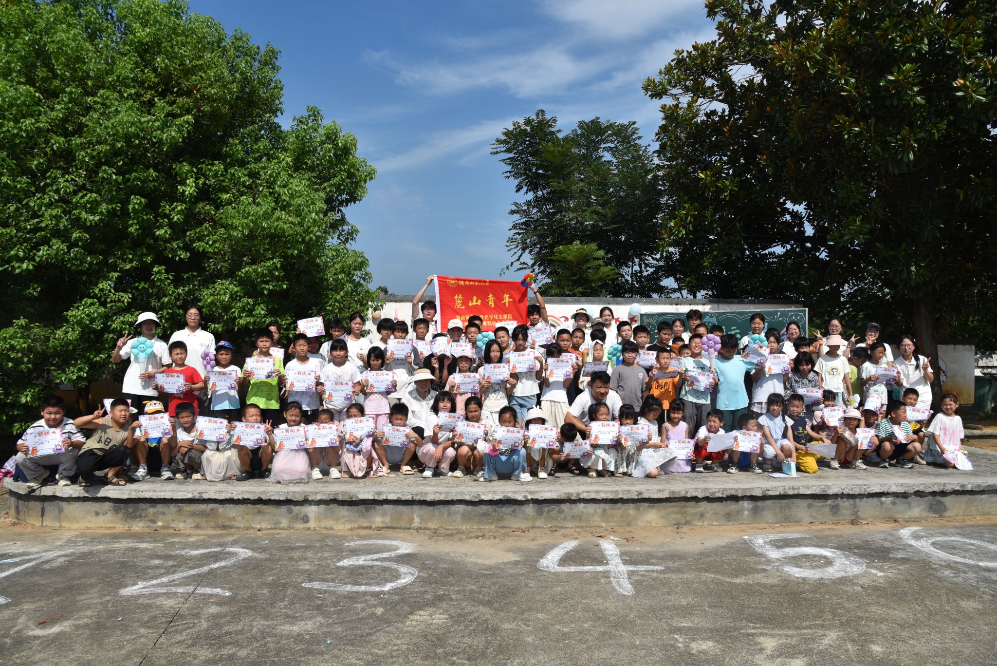 图为“麓山青年”暑期社会实践团在流塘村村委会举办趣味运动会闭幕式合影。