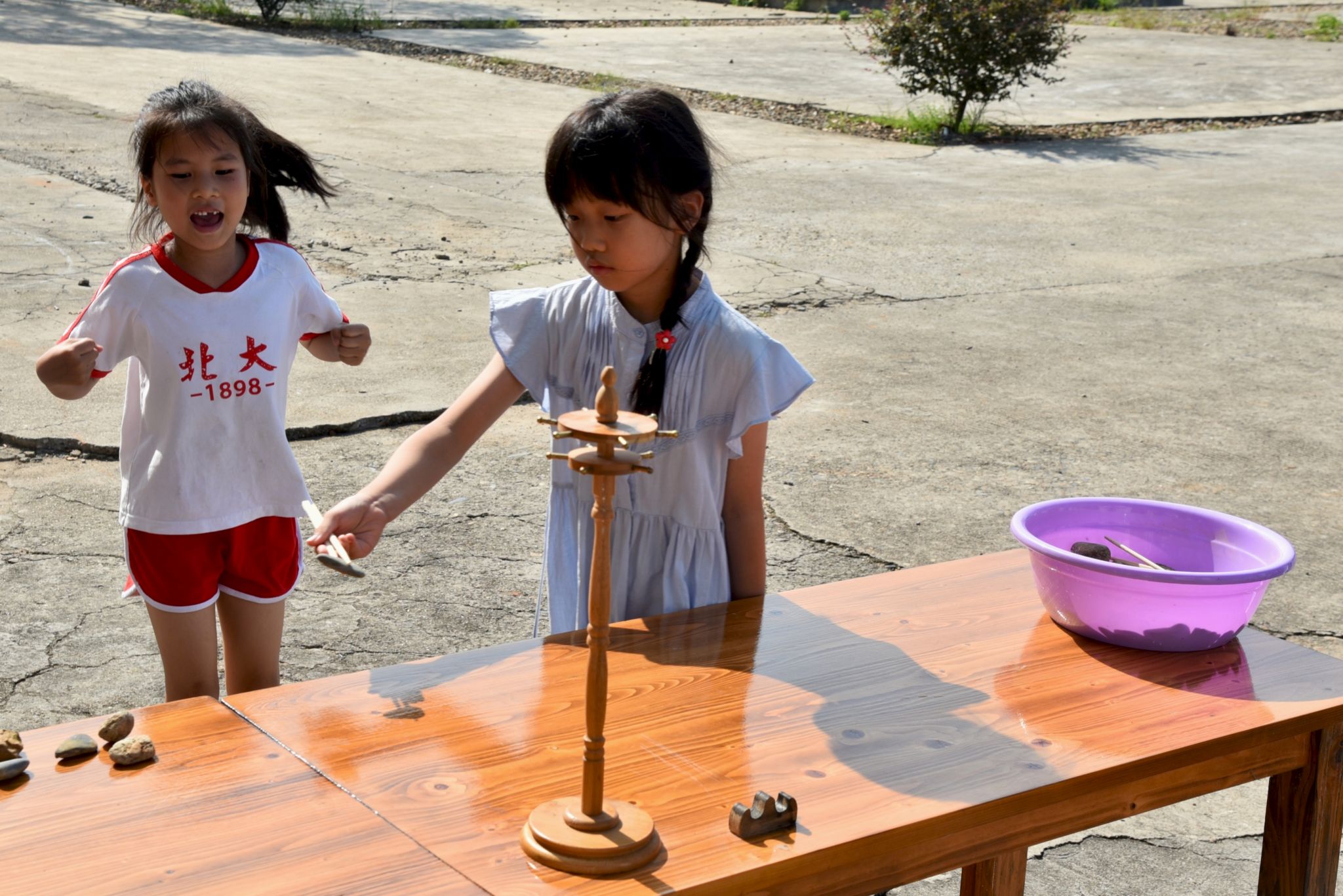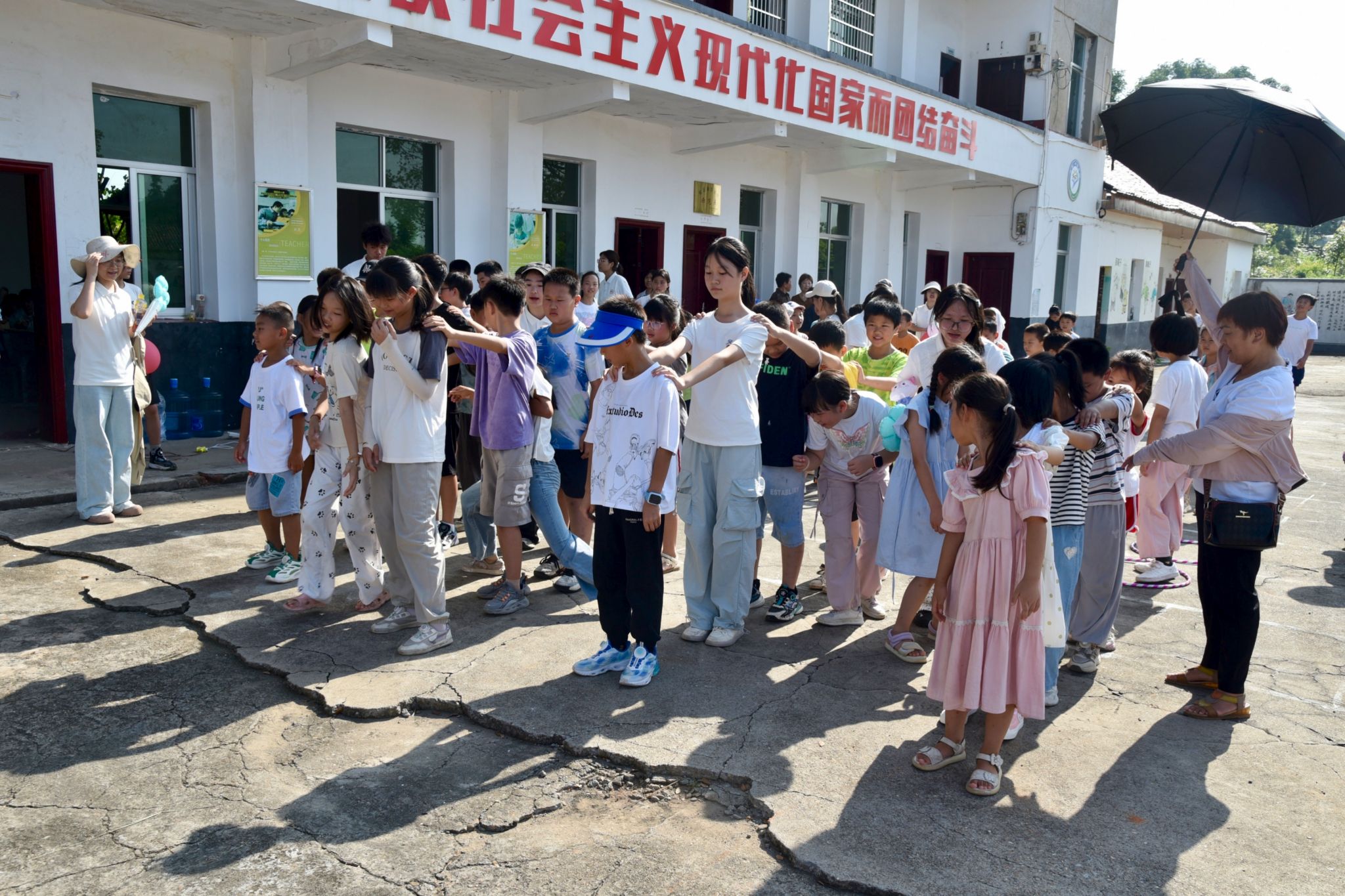 图为小马过河比赛前,老师给学生示范游戏玩法,学生跃跃欲试等待比赛开始。