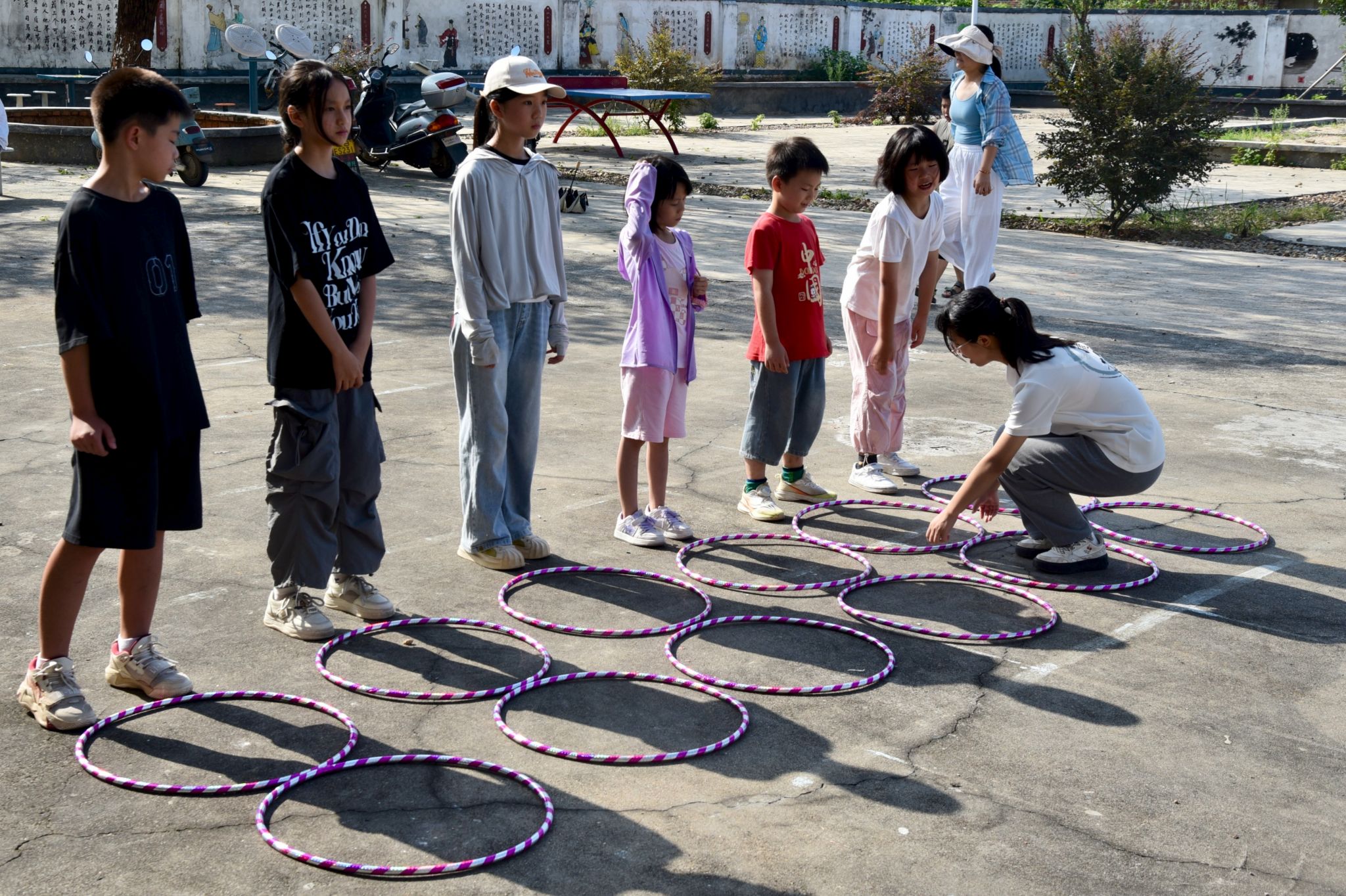 图为竞速穿梭乐比赛中,学生合作穿过呼啦圈,用时少者获胜。