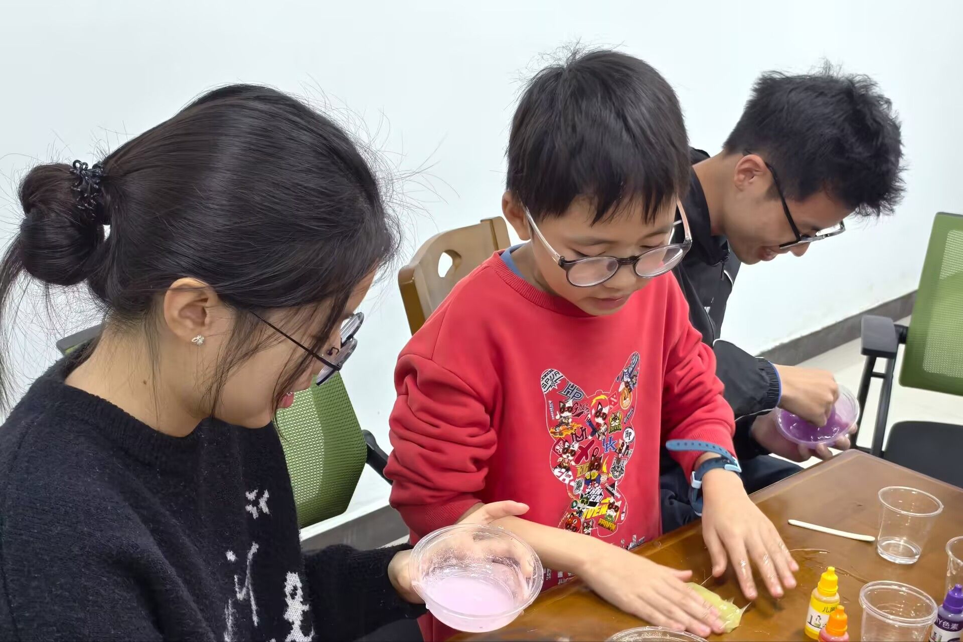志愿者与小朋友共同制作硼砂水晶泥