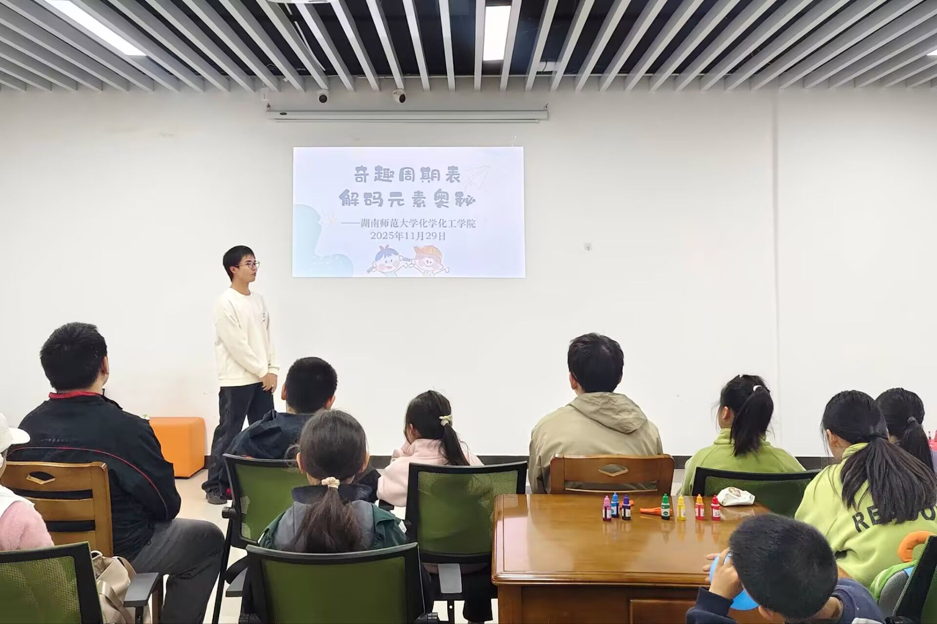 此次活动分为理论讲解与实践操作两个环节。在理论讲解环节,主讲人围绕化学元素周期表前五位元素,通过图文并茂的方式带领小朋友们初步认识了这些元素的性质。同时,讲解过程中穿插生动科普动画,进一步激发了孩子们对科学世界的好奇与探索热情。在实践操作环节,志愿者耐心引导小朋友完成氦气球制作与硼砂水晶泥调配,孩子们动手尝试、踊跃提问,在实践中体会到了化学的奇妙魅力。制作完成后,小朋友们手持作品与志愿者合影留念,志愿者对活动现场进行清理。