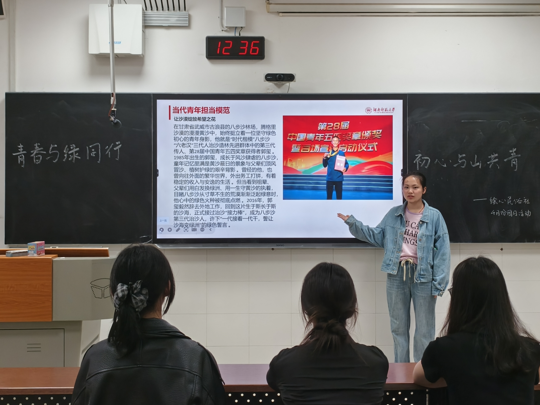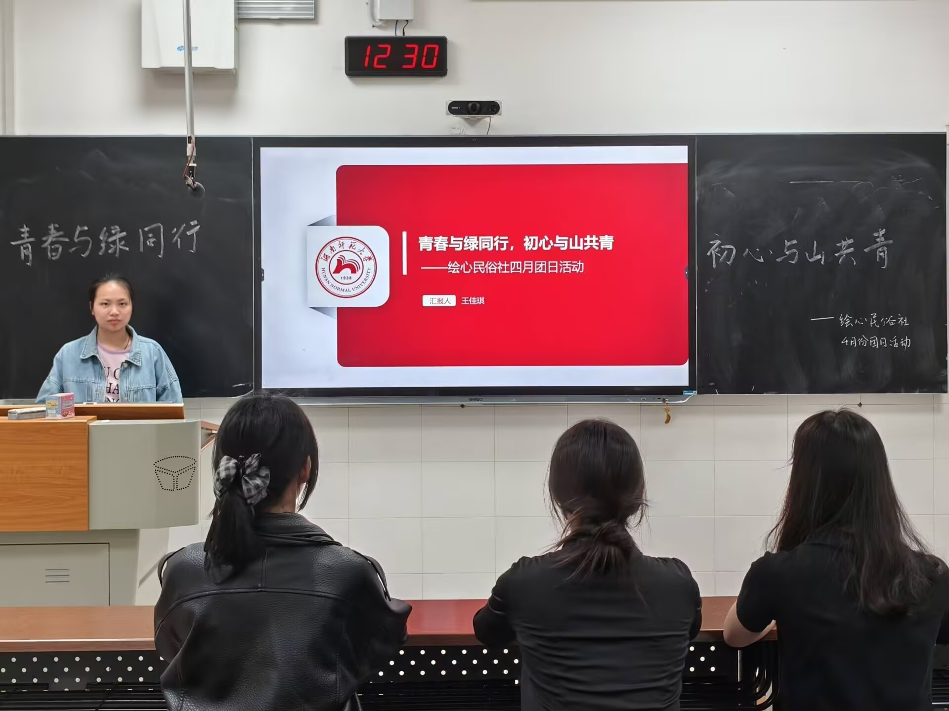 (通讯员王佳琪)4月20日上午,我院绘心民俗社在至善楼104教室举办以“青春与绿同行,初心与山共青”为主题的团日活动。此次活动由绘心民俗社理事王佳琪主持,绘心民俗社理事会全体成员参与。