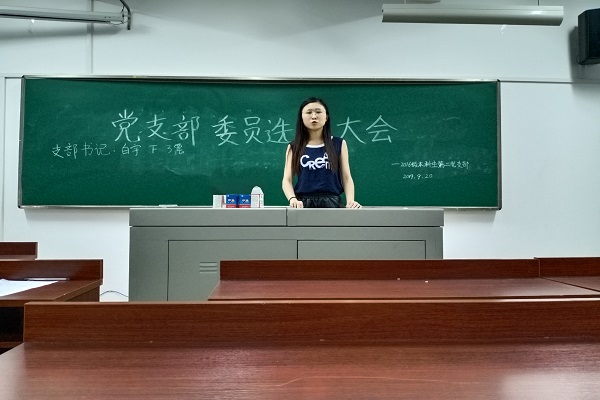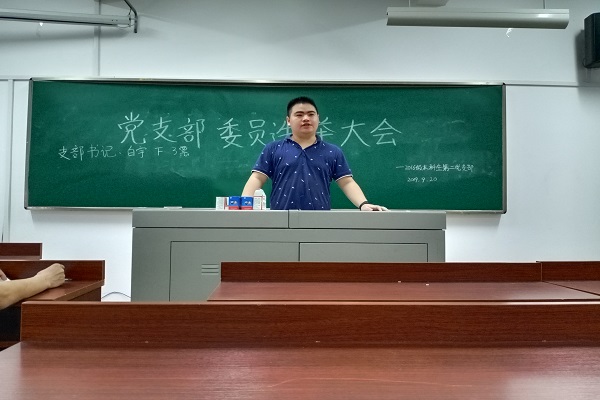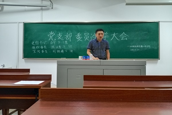 在通过监票人名单后,党支部书记、组织委员、宣传委员候选人依次上台进行述职演讲,在场正式党员根据候选人述职情况,以民主投票的方式选举白宇同志为党支部书记,陈义香同志为组织委员,刘皓峰同学为宣传委员。