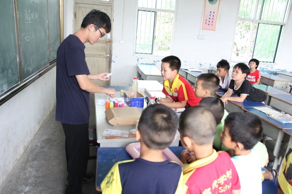 7月15日下午14时30分,英国365集团学生社团联合会赴祁东暑期社会实践团开展趣味实验课程,由化学老师苏文韬带领孩子们做实验。