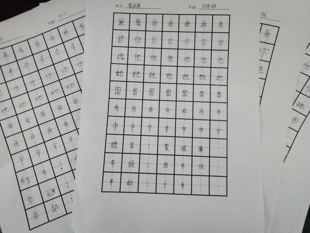 蓝杨浚书写了一篇硬笔书法作品,向学生们进行展示。陈志霞向同学们讲解握笔姿势,并对学生们的姿势进行指导并给两个班级的学生安排了不同的比赛内容,学生根据比赛内容书写并上交作品。最后,实践团的队员对学生的作品进行了等级评定与评价。