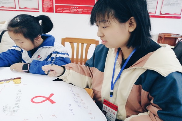 志愿者们于9时在岳龙社区集合。在桂甜甜为大家讲解此次活动的内容后,志愿者教孩子们绘画预防艾滋病的海报,讲解艾滋病的危害,并与孩子们互动沟通。在场的家长们也参与了海报绘画并与志愿者交流艾滋病的预防知识。活动结束后,志愿者们共同拍照留念。