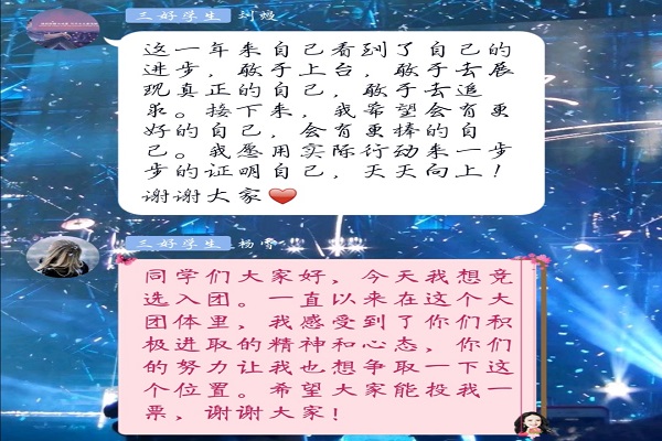 付辛辛宣布投票规则,此次选举采取线上群投票的方式。候选人依次进行发言,讲述个人事迹,未来规划及思想认识。全体与会人员进行投票,此次投票在班级通知群进行,保证了此次投票的公平公正。投票结束,危嬴,杨雪,王洁刘熳,李金蓓成功入选。