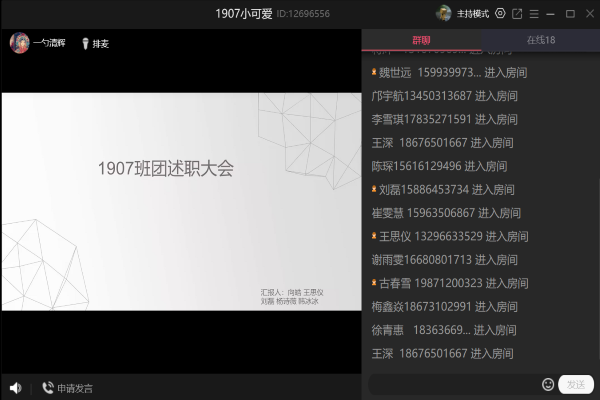 (通讯员  杨诗薇)4月25日15时20分,1907班在班级通知群内准时进行述职大会。此次会议由班长向皓主持,同学通过群通话加入到活动中。