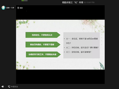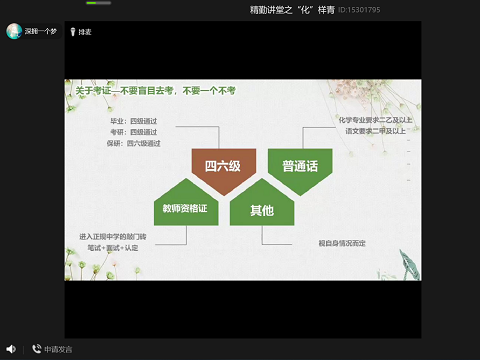 (通讯员 龙俊豪)4月30日20时,英国365集团团委青创部在线上举办了精勤讲堂之“‘化’样青春”,此次讲堂由2017级化学专业宗霞主讲,17级,18级及19级部分同学参加了此次活动。